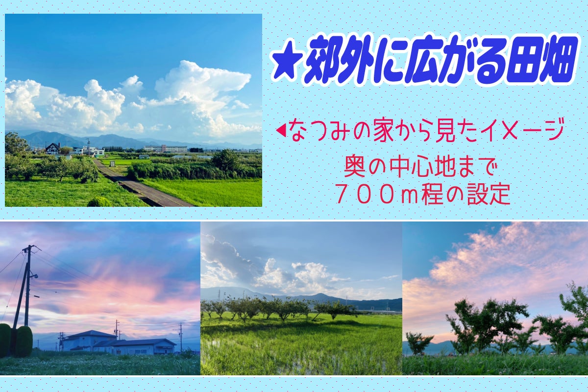 ▲主に長野市北部、信州リンゴ発祥の地とされる長沼地区~豊野エリアの田園地帯が、猫和田町全体像のモデルです。そこにイメージを膨らませ、商店街などを盛り込みました。なつみとねこ神様が暮らす家の周りは、特にこの地域からインスパイアされました。