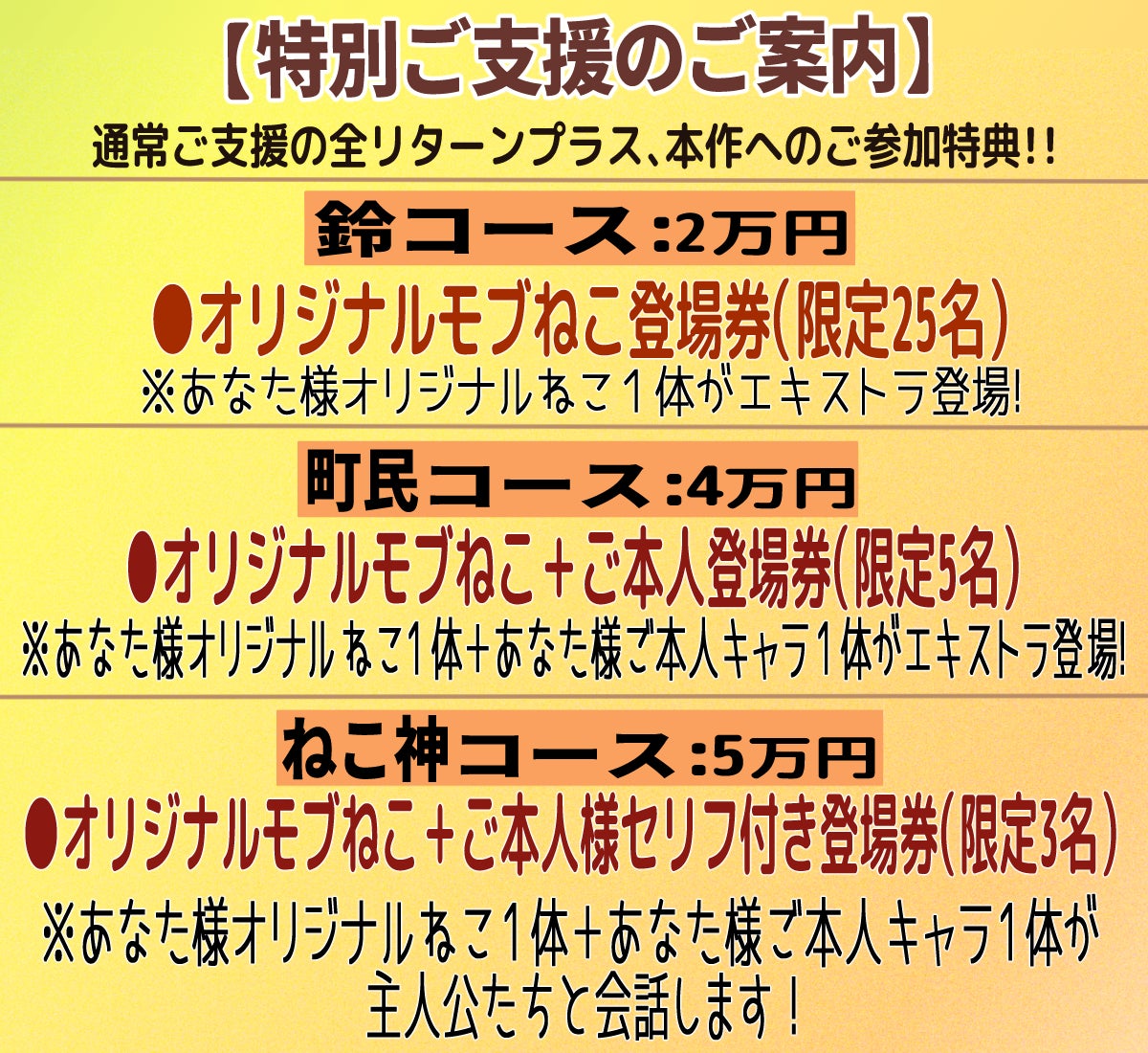 ねこ神コースのセリフ・会話内容は、物語に沿った内容で私の判断になります。セリフ・内容の指定は出来ませんのでご了承下さい。尚、「特別ご支援」でデイザンしたキャラクターは、プロジェクトオーナーの私に著作権が帰属される事をご留意くださいませ。