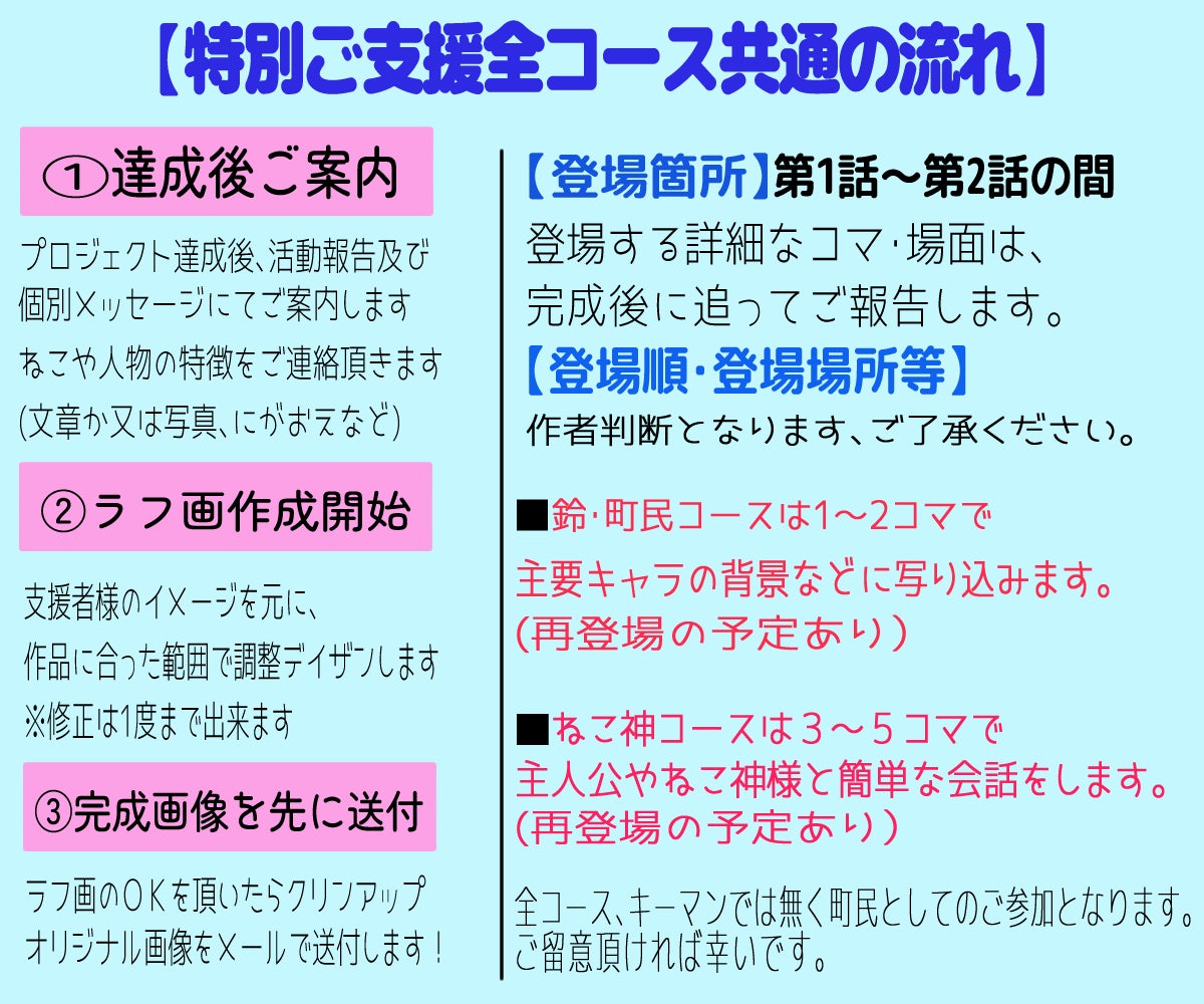 上記通常ご支援の全リターンのお受け取りに加え、本作へのご参加コースもご用意しています!「自分で考えたキャラクターがマンガに登場して欲しい!」「本作への参加度をより深めたい!」と感じて頂けた方向けの【特別ご支援】のご案内です!