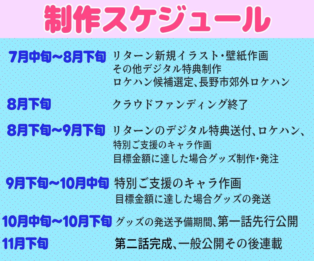※目標金額に達しなかった場合でもリターンに含まれる「第一、第二話」は制作可能ですが、目標金額に達すると非常にスムーズに連載の活動が出来る為、ご支援頂ければとっても助かります!