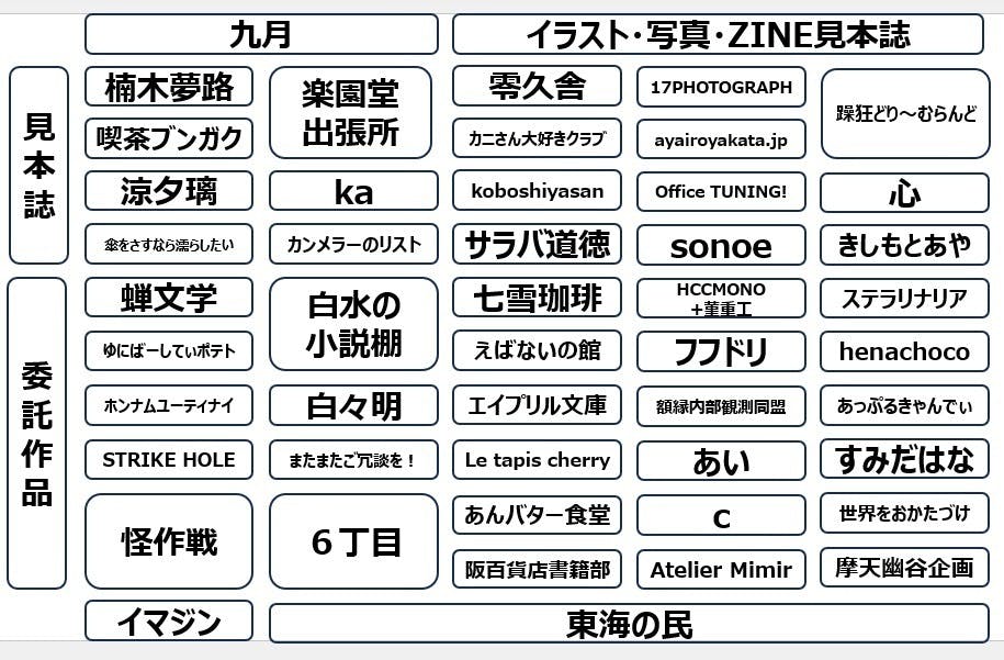 この時、普段は名古屋のイラストイベントに参加されるイラストレーターさん・漫画家さん、普段は名古屋のデザインイベントに参加されるグッズ製作者さん、アートクリエイターさんにもご参加いただきました。結果として若いクリエイターが普段とは違う場所で邂逅する不可思議も楽しさがある空間が文芸・ZINE作家さん・イラストレーターさん・漫画家さん・写真家さん・グッズ製作者さん・クリエイターさんの間で生じました。