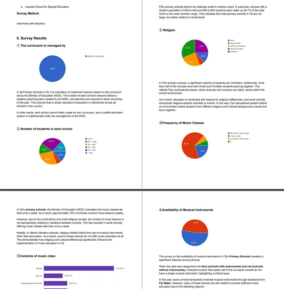 また、JICA(国際協力機構)が発表している「対フィジー共和国 国別開発協力方針 別紙 2023年事業展開計画」では、フィジーにおける「社会サービスの質の向上」が2036年までに達成すべき中期目標として定められています。更に、同紙には「2011年から正規科目として導入された情操教育(体育、音楽、図工)については、必須科目であるにも関わらず、指導法を十分に理解していない教員が多く、普及と定着が課題となっている。特に、教育の質向上に向けて、情操教育や理数科科目のカリキュラム・指導法の改善、障害者や女性といった社会的弱者に配慮した教育サービスの提供、また、スポーツや職業訓練を通じた人材育成に係る協力を行う。」とあり、中期目標達成の為、音楽教育の質の向上と指導法の確立が、具体的な活動方針として定められています。
