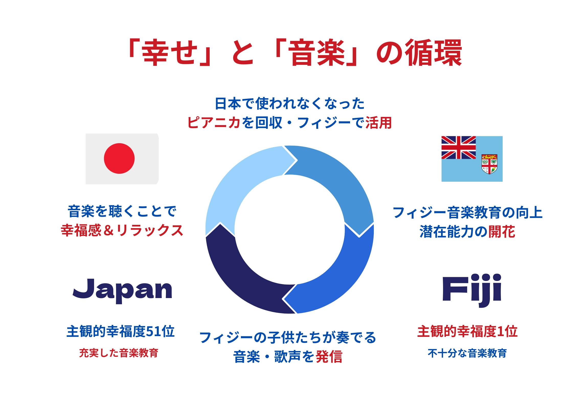 このプロジェクトは、そうした国際「共」力の第一歩です。まずは、日本で使われなくなったピアニカをフィジーの小学校に届け、子どもたちが音楽を学ぶ機会をつくります。そして、寄贈していただいた方へは、ピアニカを通してフィジーの子どもたちが奏でる音楽を、ミュージックビデオという形でお届けします。この活動が広がっていけば、フィジーは音楽教育の充実という形で恩恵を受け、日本側はフィジーのリアルな暮らしや価値観に触れることで、新たな視点や癒し、音楽を通じた幸福感を得ることができます。実際、音楽が幸福度を向上させるという研究結果は多く報告されており、音楽を聴くことで脳内のドーパミンが増加し、ストレスが軽減されることが分かっています。本プロジェクトを通じ、主観的幸福度が世界でもトップクラスと言われるフィジーから「幸せを奏でる音楽」が生まれ、世界中の人々に希望や癒しを届ける存在になるでしょう。