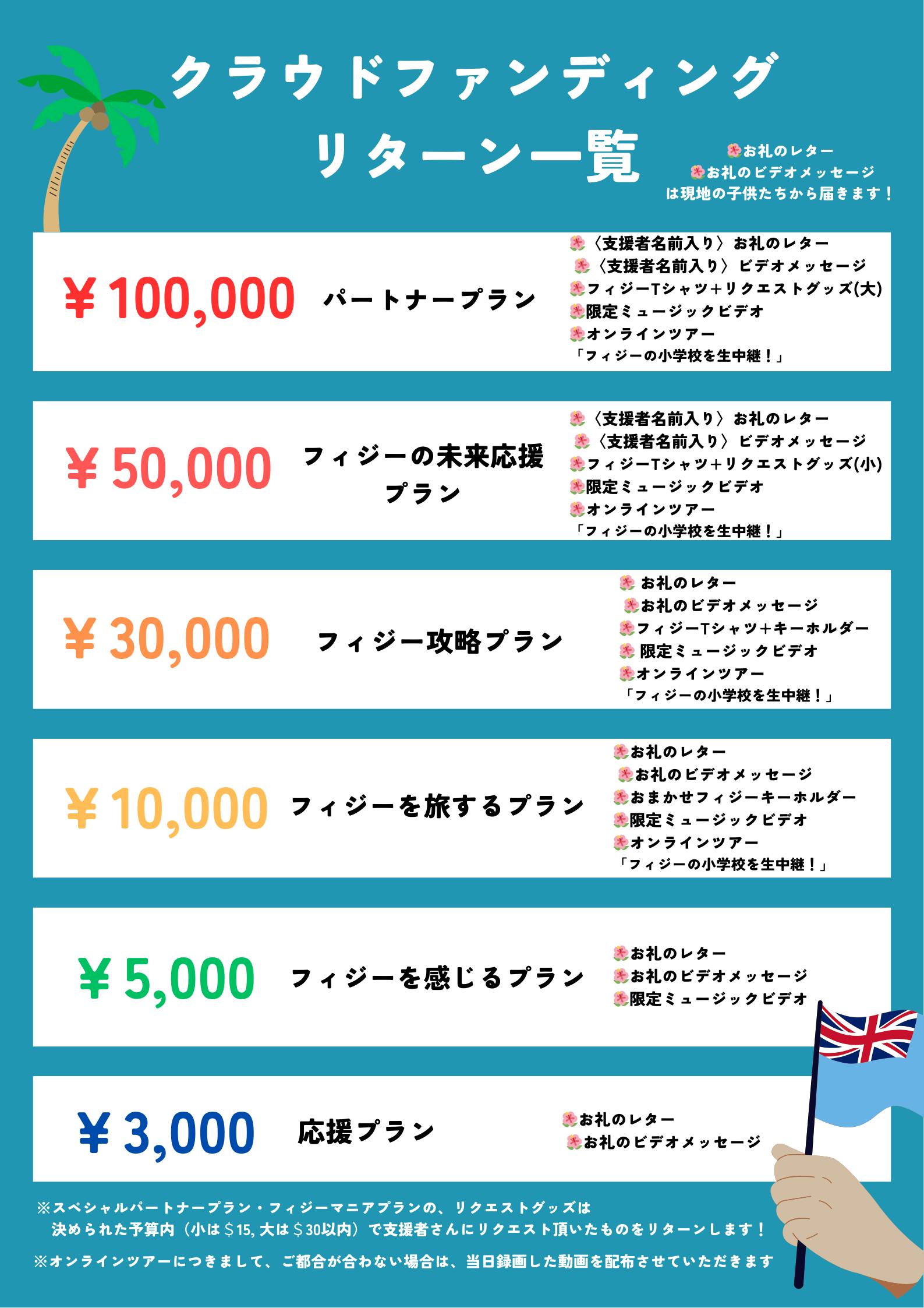 本クラウドファンディングでは、6つのプランを用意しています。より多くの人にフィジーを楽しんでいただけるようなリターンを考えましたので、ぜひご検討下さい!