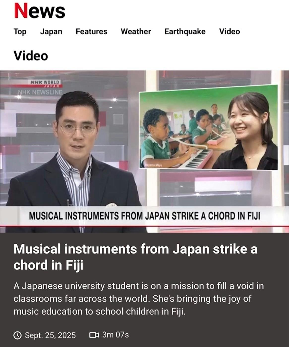 2025/10/04 08:45お久しぶりです。まゆです!クラウドファンディングを終えて約4カ月が経ちました。私は今どこで何をしているのか、直近の活動報告と共にお伝えしていきたいと思いますまずは、BIG NEWSとして3点!フィジーにおける音楽教育支援プロジェクトがメディアで特集されました。【メディア掲載について】①神戸新聞 掲載(5月31日)神戸新聞の記者の方ともご縁があり、取材&記事を掲載して頂きました!以下、記事全文です!良ければ読んでみてください!—-------------------------------------------『南国に響け 、鍵盤ハーモニカ ~音楽遠し、心豊かに育って~』「フィジーってどこにあるんかな?」「使ってくれたらうれしいね」今年3月、宝塚市塔の町の小林聖心女子学院小学校。卒業式の前日、6年生がそれぞれの鍵盤ハーモニカを抱え、音楽室に集まった。同学院の卒業生、稲山茉佑さん(21)=尼崎市=が進めるプロジェクトに協力するためだ。寄せられた約20台は今秋、南太平洋の島国フィジーの小学校に届き、音楽の授業で役立てられる。同学院高校を3年前に卒業した稲山さんは、同志社大経済学部の3年生。昨年12月、社会課題の解決法を考えるプログラムへ参加したことをきっかけに、日本で使われなくなった鍵盤ハーモニカをフィジーの小学校に送るプロジェクトを立ち上げた。「高校生の頃から途上国での情操教育に関わりたかった」と話す。今年2月にフィジーへ初めて渡り、西部の都市ラウトカ市にある小学校約20校を1カ月かけて回った。持参した鍵盤ハーモニカの音を鳴らすと、子どもたちは目を輝かせた。鍵盤に1〜8の数字を振り、数字を追って、きらきら星を演奏してみせてくれたという。「音楽が身近にあって、才能にあふれている」音楽教育の実態を聞き取ると、「音楽クラブはあるのに楽器が全くなかったり、ピアノがなく授業で歌うことしかできなかったり。早急に支援が必要だと感じた」。すぐに教育省の担当者に会い、取り組みの必要性をアピール。同省の公認プロジェクトとして承認された。活動に賛同したNPO法人「グッドライフ」(大阪府四條畷市)の協力を得て、第1弾として100台をフィジーに船便で輸送した。5月上旬に現地に到着し、6月から同市内の3校で導入される計画だ。支援を続けるため、稲山さんは母校の後輩たちから鍵盤ハーモニカを集めたいと依頼。協力した海辺真裕香さん(12)は「コロナであまり吹けなかったからまだきれいだと思う」とそっと回収箱へ。安賀恵さん(13)は「使ってもらったら鍵盤ハーモニカもうれしいんじゃないかな」と笑顔で話していた。今後、稲山さんはフィジーでの授業の様子を動画で共有しながら、指導者の育成や指導マニュアルづくりにも取り組むという。自身が小学生の時、母と見に行った劇団四季の舞台で音楽に魅了された。その感動が今も心に残っているといい、「音楽を通して、子どもたちの心がもっと豊かに育ってくれたらうれしい」と力を込めた。—------------------------------------------------------------------------------②NHK「おはよう日本」出演(6月19日)ーフィジーで音楽教育の発展に注力する理由ー鍵盤ハーモニカはどこから集めているの?ー現地の授業はどのように改善された?ー今後の展望は?などのコンテンツで、5分間の特集を組んでいただきました!TV取材を受けるのは人生初でとても緊張しましたが、記者・制作の方が上手に思いをくみ取って下さり、素敵な映像となりました!③NHK world出演(9月25日)放送内容はNHK「おはよう日本」(6月19日)で放映された内容と同じですが、NHK worldにも出演させて頂きました!このように活動を取り上げていただき、認知度を拡大できることはとてもうれしいです。【今後の活動について】10/4-15でフィジーへ渡航します!今回は2週間の短期滞在ですが、鍵盤ハーモニカの輸送にご協力いただいているNPO法人「グッドライフ」の皆さま、日本・世界で活躍されている鍵盤ハーモニカ奏者の妹尾美穂さん、ゴミ問題・リサイクルの活動を行われている芸人のマシンガンズ滝沢さんと共に渡航予定です!活動予定内容としては・現在支援している学校での音楽セッション開催 ・輸送した鍵盤ハーモニカ(200台)を学校の授業内で機能させる体制構築・次に支援したい學校の選定・ヒアリング・フィジー文科省との関係構築・現地メディア取材・教材作成・配布・現地の子供が奏でる音楽のMV撮影・作成・クラウドファンディングのリターン準備を予定しております【活動にはせる思いと今後の方向性】私は、フィジーのラウトカ市にある20校すべての子どもたちが、継続的に音楽教育を受けられる環境をつくることを目指しています。この活動は一度きりではなく、社会人・大人になってからも続けていきたいと強く思っています。そのためには、地元・支援者の方々にも協力をお願いし、マンスリーサポーター制度など持続的に支援できる仕組み を整えていくことが必要であると考えており、今後の体制構築にも注力していきたいと考えておりま
