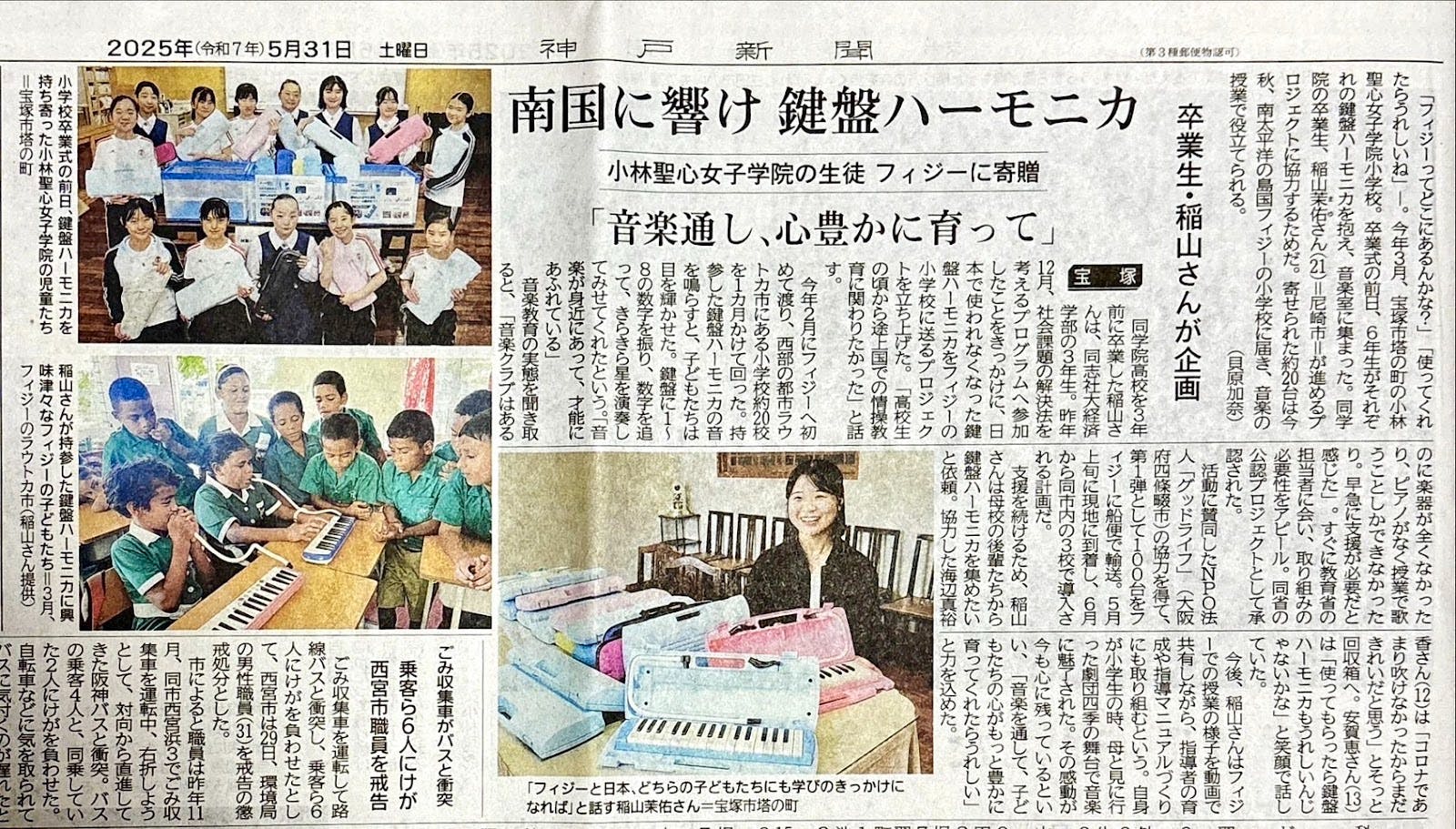 卒業式の前日、6年生がそれぞれの鍵盤ハーモニカを抱え、音楽室に集まった。同学院の卒業生、稲山茉佑さん(21)=尼崎市=が進めるプロジェクトに協力するためだ。寄せられた約20台は今秋、南太平洋の島国フィジーの小学校に届き、音楽の授業で役立てられる。
