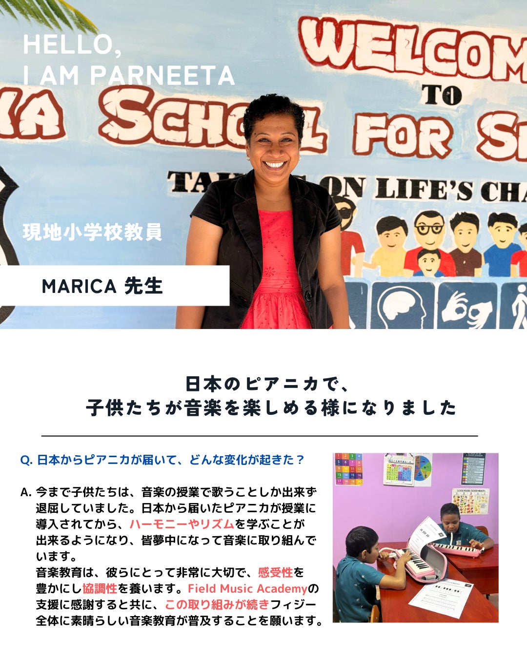 2025/10/04 08:45お久しぶりです。まゆです!クラウドファンディングを終えて約4カ月が経ちました。私は今どこで何をしているのか、直近の活動報告と共にお伝えしていきたいと思いますまずは、BIG NEWSとして3点!フィジーにおける音楽教育支援プロジェクトがメディアで特集されました。【メディア掲載について】①神戸新聞 掲載(5月31日)神戸新聞の記者の方ともご縁があり、取材&記事を掲載して頂きました!以下、記事全文です!良ければ読んでみてください!—-------------------------------------------『南国に響け 、鍵盤ハーモニカ ~音楽遠し、心豊かに育って~』「フィジーってどこにあるんかな?」「使ってくれたらうれしいね」今年3月、宝塚市塔の町の小林聖心女子学院小学校。卒業式の前日、6年生がそれぞれの鍵盤ハーモニカを抱え、音楽室に集まった。同学院の卒業生、稲山茉佑さん(21)=尼崎市=が進めるプロジェクトに協力するためだ。寄せられた約20台は今秋、南太平洋の島国フィジーの小学校に届き、音楽の授業で役立てられる。同学院高校を3年前に卒業した稲山さんは、同志社大経済学部の3年生。昨年12月、社会課題の解決法を考えるプログラムへ参加したことをきっかけに、日本で使われなくなった鍵盤ハーモニカをフィジーの小学校に送るプロジェクトを立ち上げた。「高校生の頃から途上国での情操教育に関わりたかった」と話す。今年2月にフィジーへ初めて渡り、西部の都市ラウトカ市にある小学校約20校を1カ月かけて回った。持参した鍵盤ハーモニカの音を鳴らすと、子どもたちは目を輝かせた。鍵盤に1〜8の数字を振り、数字を追って、きらきら星を演奏してみせてくれたという。「音楽が身近にあって、才能にあふれている」音楽教育の実態を聞き取ると、「音楽クラブはあるのに楽器が全くなかったり、ピアノがなく授業で歌うことしかできなかったり。早急に支援が必要だと感じた」。すぐに教育省の担当者に会い、取り組みの必要性をアピール。同省の公認プロジェクトとして承認された。活動に賛同したNPO法人「グッドライフ」(大阪府四條畷市)の協力を得て、第1弾として100台をフィジーに船便で輸送した。5月上旬に現地に到着し、6月から同市内の3校で導入される計画だ。支援を続けるため、稲山さんは母校の後輩たちから鍵盤ハーモニカを集めたいと依頼。協力した海辺真裕香さん(12)は「コロナであまり吹けなかったからまだきれいだと思う」とそっと回収箱へ。安賀恵さん(13)は「使ってもらったら鍵盤ハーモニカもうれしいんじゃないかな」と笑顔で話していた。今後、稲山さんはフィジーでの授業の様子を動画で共有しながら、指導者の育成や指導マニュアルづくりにも取り組むという。自身が小学生の時、母と見に行った劇団四季の舞台で音楽に魅了された。その感動が今も心に残っているといい、「音楽を通して、子どもたちの心がもっと豊かに育ってくれたらうれしい」と力を込めた。—------------------------------------------------------------------------------②NHK「おはよう日本」出演(6月19日)ーフィジーで音楽教育の発展に注力する理由ー鍵盤ハーモニカはどこから集めているの?ー現地の授業はどのように改善された?ー今後の展望は?などのコンテンツで、5分間の特集を組んでいただきました!TV取材を受けるのは人生初でとても緊張しましたが、記者・制作の方が上手に思いをくみ取って下さり、素敵な映像となりました!③NHK world出演(9月25日)放送内容はNHK「おはよう日本」(6月19日)で放映された内容と同じですが、NHK worldにも出演させて頂きました!このように活動を取り上げていただき、認知度を拡大できることはとてもうれしいです。【今後の活動について】10/4-15でフィジーへ渡航します!今回は2週間の短期滞在ですが、鍵盤ハーモニカの輸送にご協力いただいているNPO法人「グッドライフ」の皆さま、日本・世界で活躍されている鍵盤ハーモニカ奏者の妹尾美穂さん、ゴミ問題・リサイクルの活動を行われている芸人のマシンガンズ滝沢さんと共に渡航予定です!活動予定内容としては・現在支援している学校での音楽セッション開催 ・輸送した鍵盤ハーモニカ(200台)を学校の授業内で機能させる体制構築・次に支援したい學校の選定・ヒアリング・フィジー文科省との関係構築・現地メディア取材・教材作成・配布・現地の子供が奏でる音楽のMV撮影・作成・クラウドファンディングのリターン準備を予定しております【活動にはせる思いと今後の方向性】私は、フィジーのラウトカ市にある20校すべての子どもたちが、継続的に音楽教育を受けられる環境をつくることを目指しています。この活動は一度きりではなく、社会人・大人になってからも続けていきたいと強く思っています。そのためには、地元・支援者の方々にも協力をお願いし、マンスリーサポーター制度など持続的に支援できる仕組み を整えていくことが必要であると考えており、今後の体制構築にも注力していきたいと考えておりま