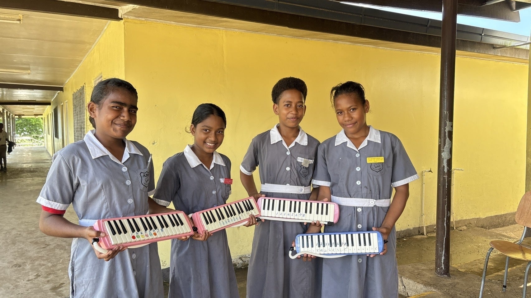 ①フィジーに計105台のピアニカを輸送し、学校の音楽教育に楽器を導入する事