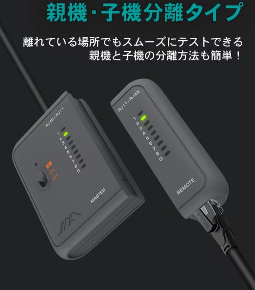 ネットワークテスターは、親機・子機分離タイプです。これにより、テストを行う際に親機と子機を離れた場所に配置できます。作業スペースや配線の状況によって自由度が高く、スムーズなテストが可能です。作業効率の向上と正確な結果の取得が期待できます。