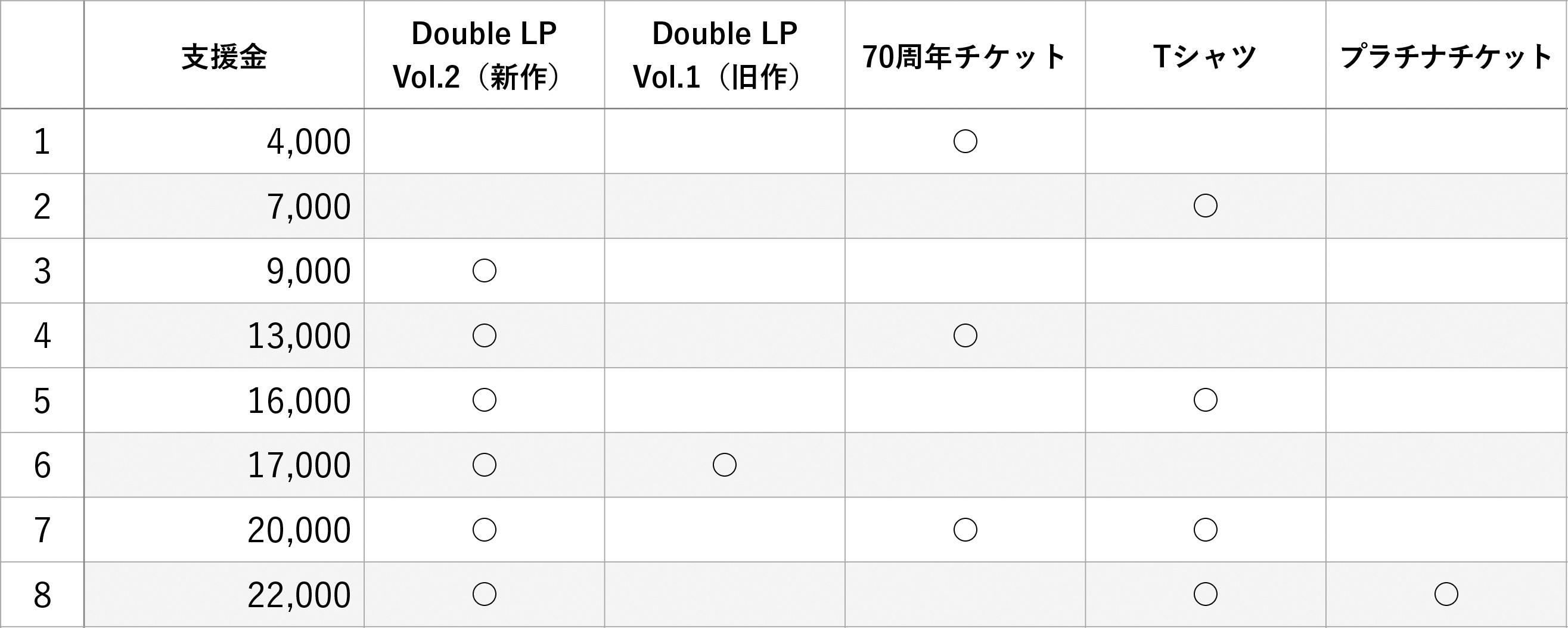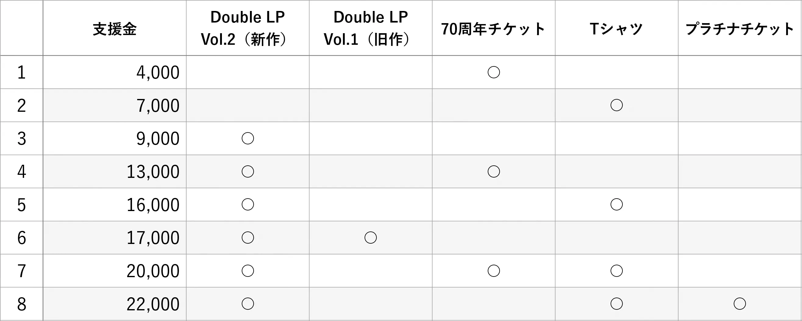 他にも2025年11月に都内某所で開かれる70周年の記念コンサートのチケットやそのプラチナ・チケット”現在”美術家 宇川直宏デザインによるアルバム・ジャケットを印刷したTシャツ。