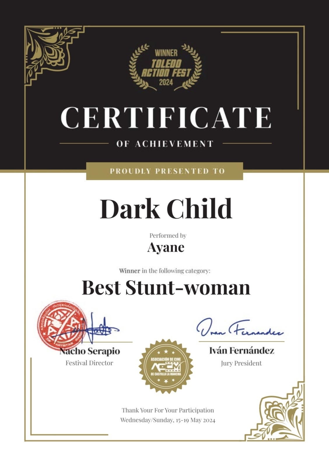 また海外で開催されたアクションショートフィルム映画祭では数多くノミネート、そしてスペインで開催されたInternational Toledo Action Film Festivalでは『BEST STUNT WOMAN』という個人賞を受賞。さらに、ニュージーランドで開催されたThird Culture Film Festival では『BEST ACTION SEQUENCE』を受賞させて頂きました。『DARK CHILD』はSNSに載せることを目的として製作したのですが、映画館での上映・舞台挨拶も2回させて頂くことができました。