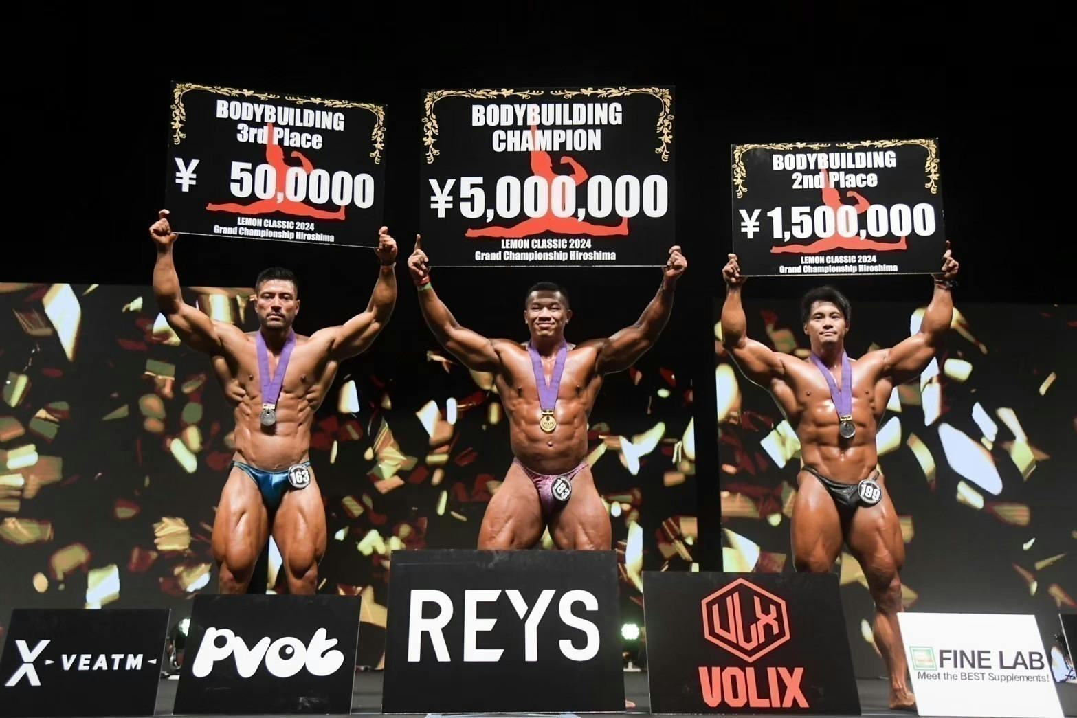 企画当初から選手の努力を讃えるために最もわかりやすい形で賞金を用意したいと考えていました。第一回大会ながらボディビル優勝者には30万円・フィジーク優勝者には5万円の賞金、入賞者の方には協賛企業様からの景品で手いっぱいに荷物持って帰っていただきました。