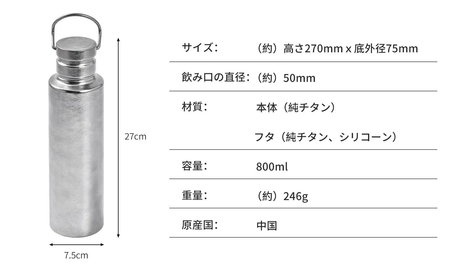 純チタンは非常に優れた特性を持つ素材で、耐食性に優れ、化学的な安定性があります。また、軽量かつ強度が高く、人体に対しても安全であります。純チタン製のボトルは、飲み物の味を損なわず、安全で健康的な飲用体験を提供します。