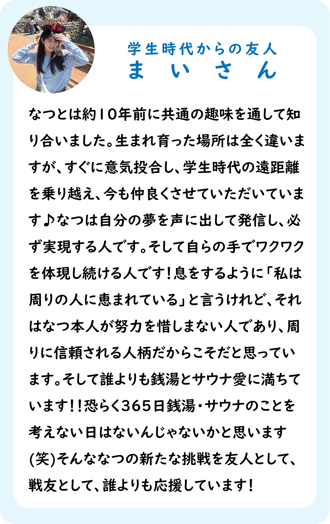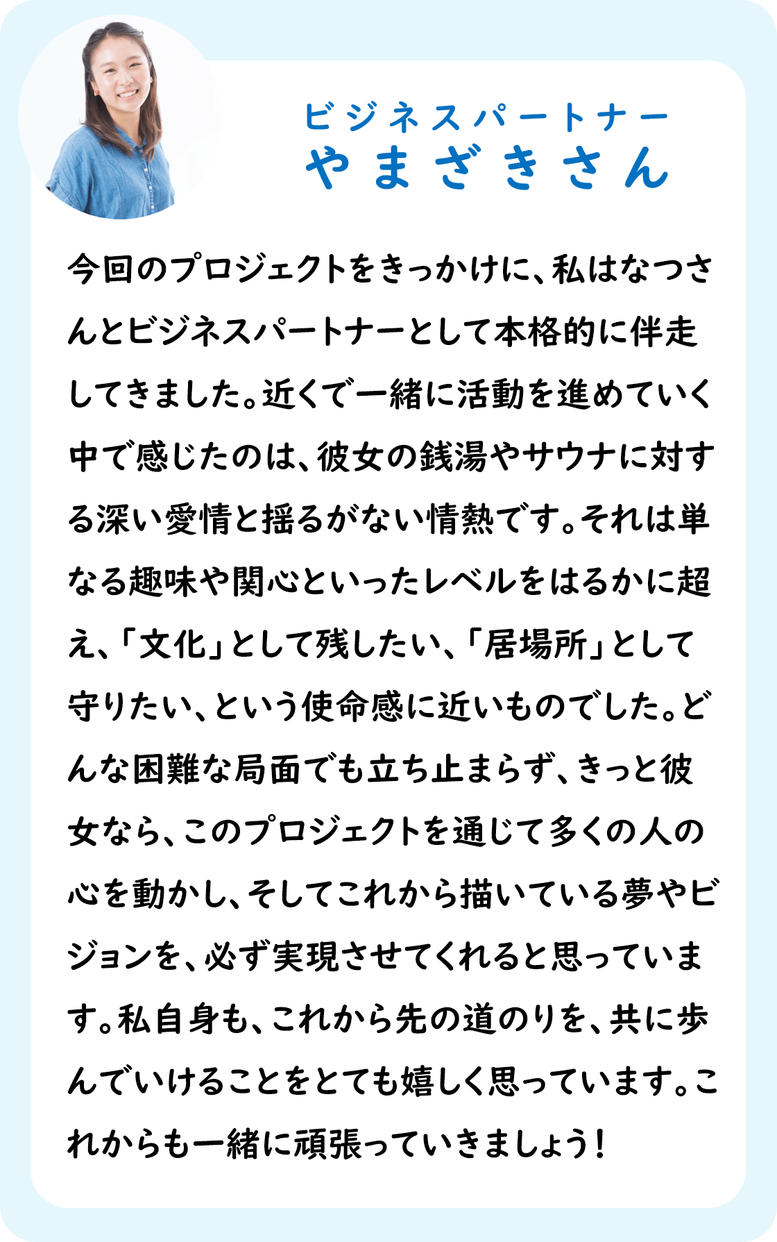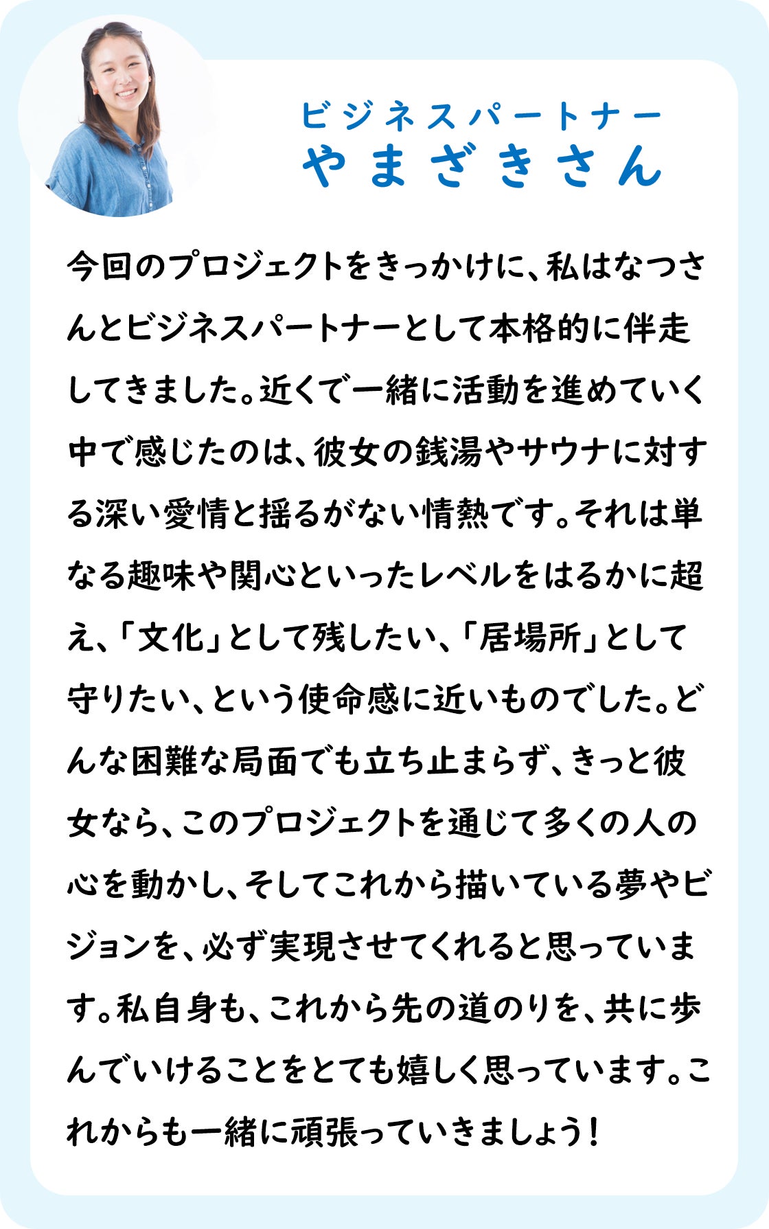 ぜひ、私たちと一緒にサウナと銭湯を守り、次世代にその魅力を伝えていただければ嬉しいです。どうか温かいご支援をよろしくお願いいたします。