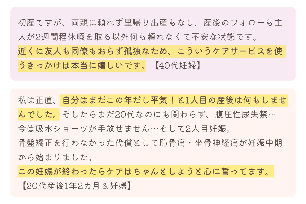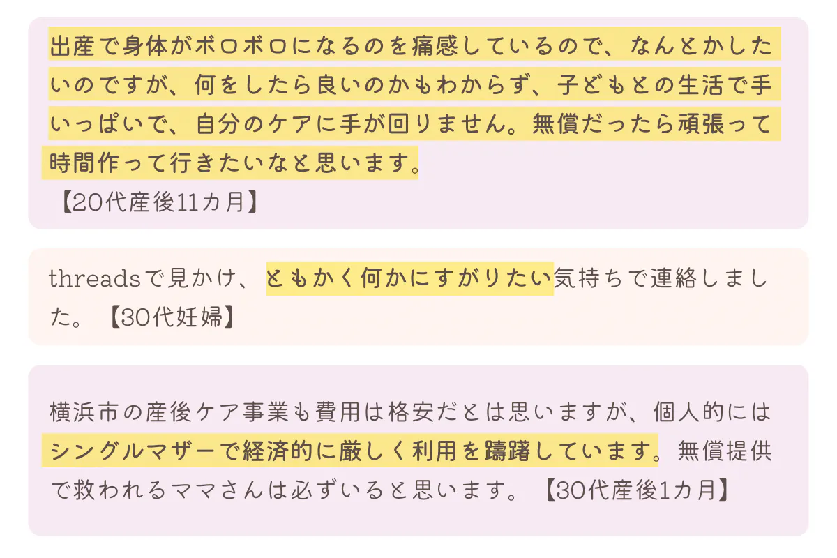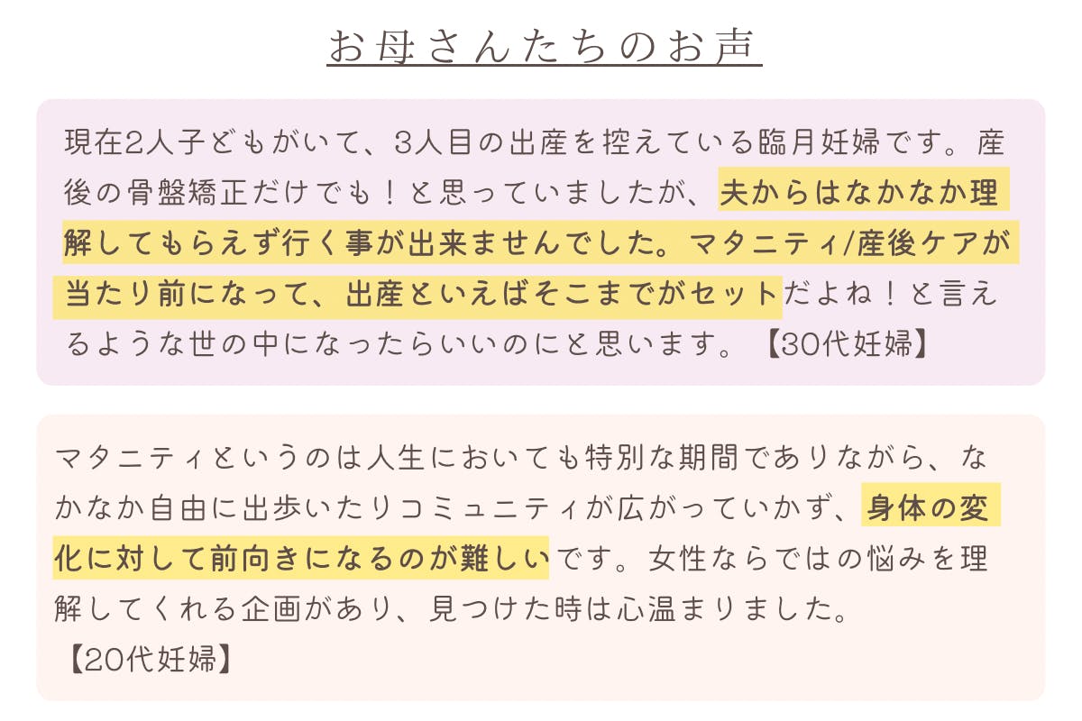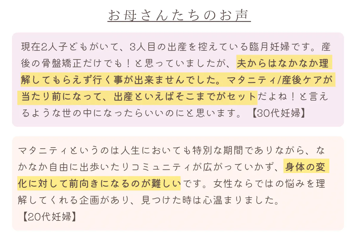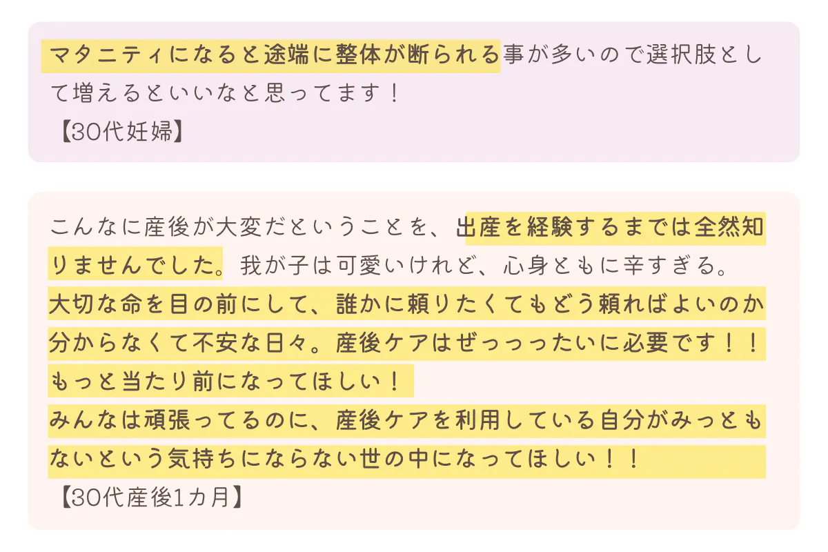 まずは、【マタニティ/産後ケアに関するアンケート】で頂戴した、声の一部をご紹介させてください。