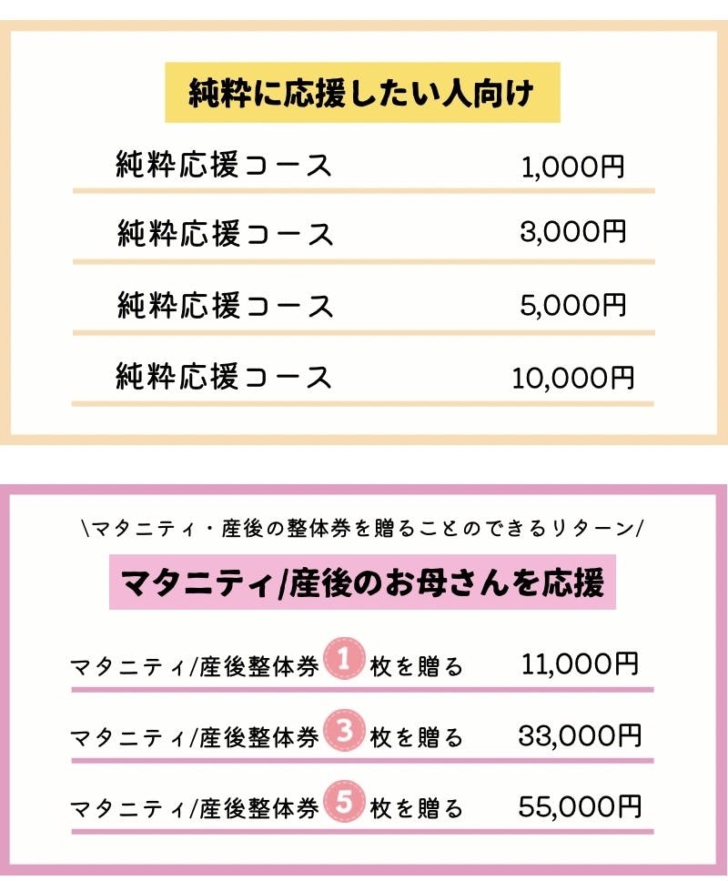 「マタニティ/産後の整体券」は、ご支援いただいた分だけお母さんをサロンにご招待し、無償でひとりひとりに合わせたケアを行います。つらい思いをしている世のお母さんに直接は何かできずとも、このような形でお母さんを応援することはできます。