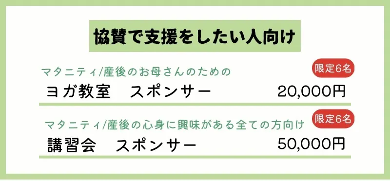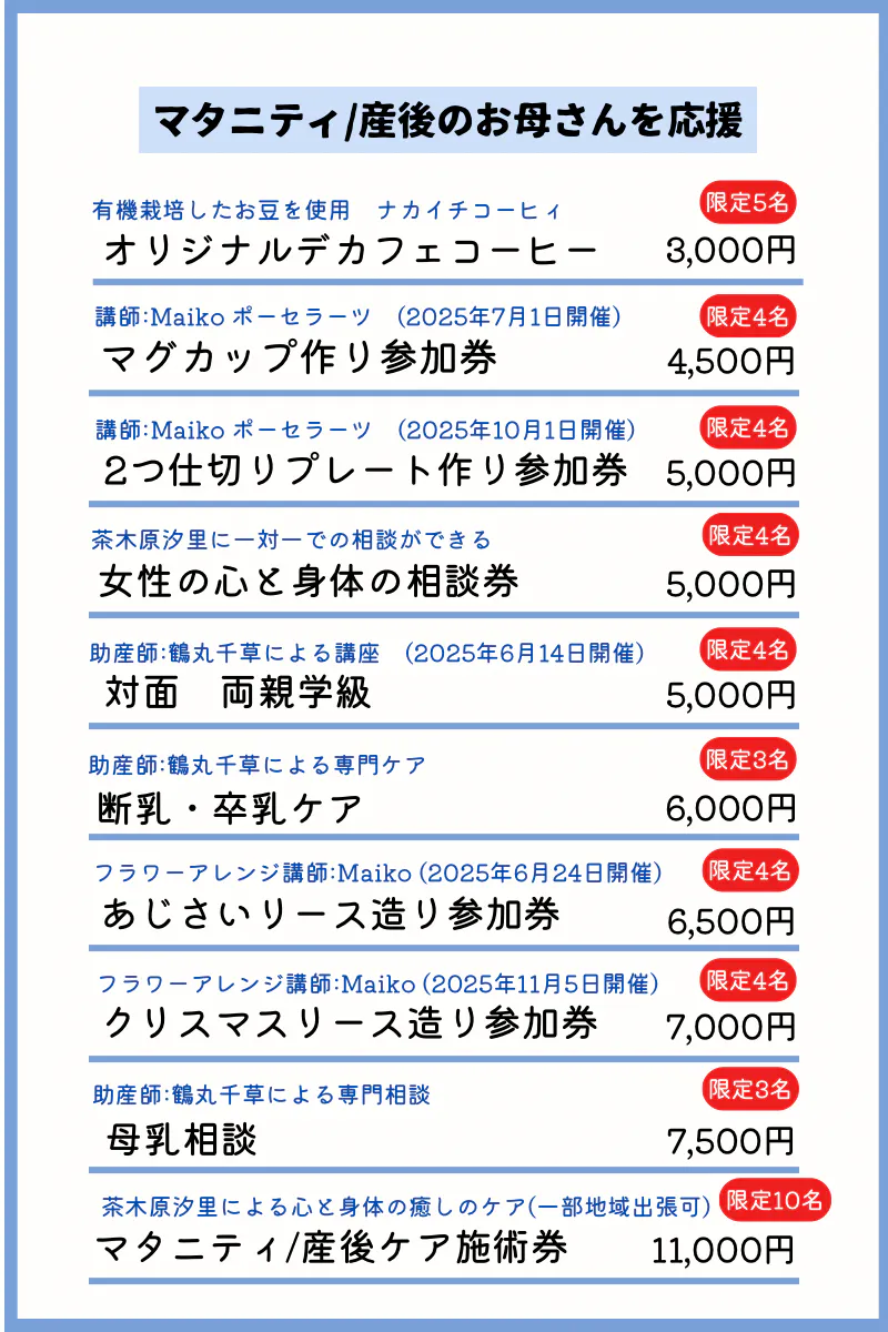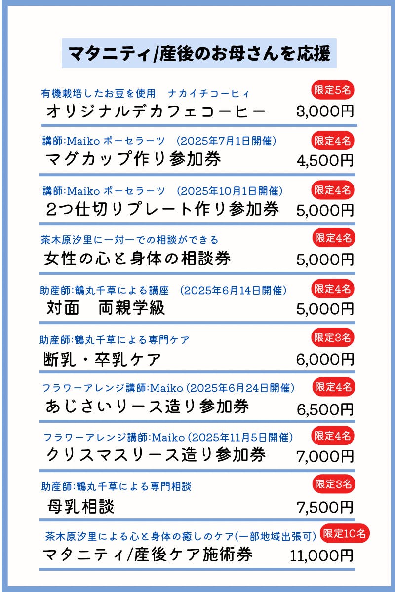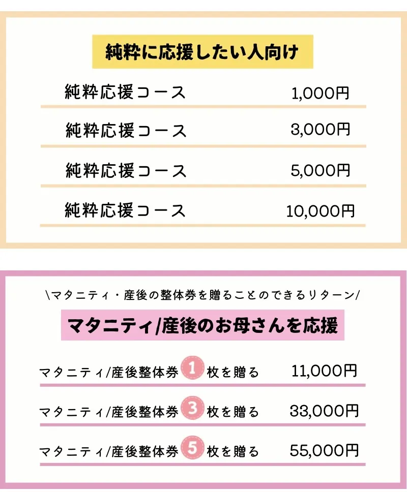 活動を応援してくださる方、妊娠中/産後のお母さんが身近にいる方、支援をされている方向けのリターンを主に設定させていただきました。