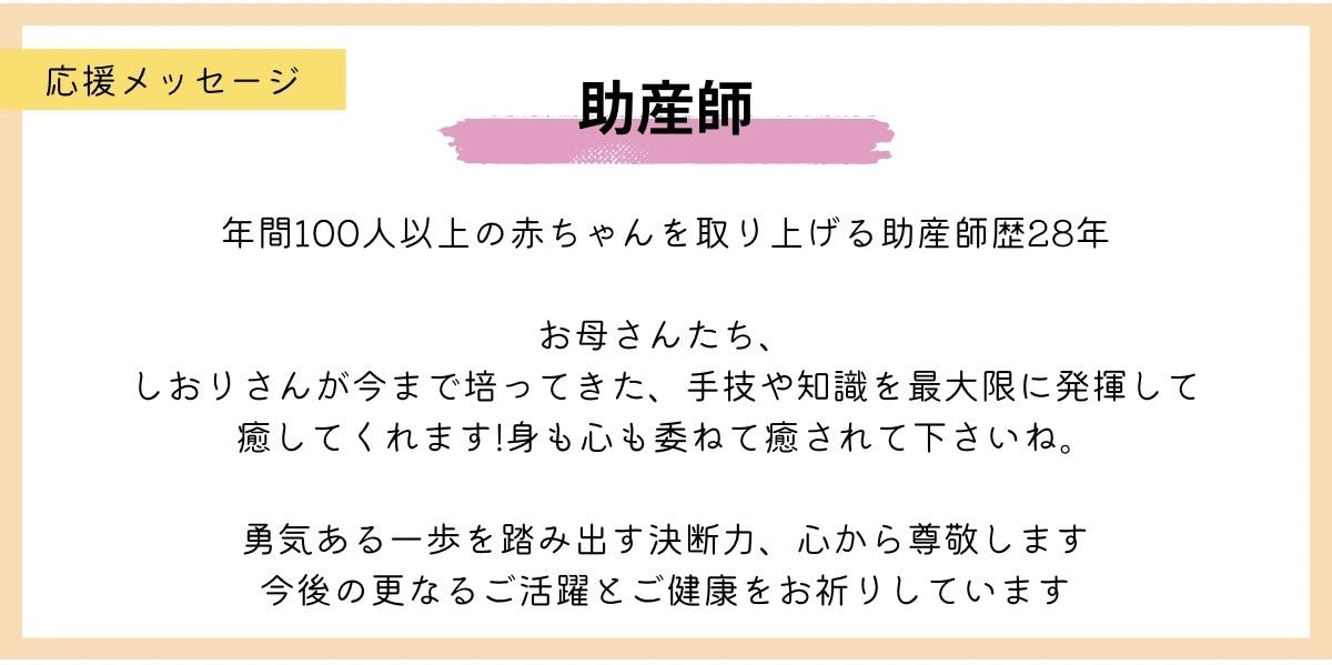 妊娠中・産後の女性を一番にサポートできる“パートナーや家族の次に寄り添う存在”でいることをモットーに、一人一人のお母さんと向き合い施術/情報を提供。