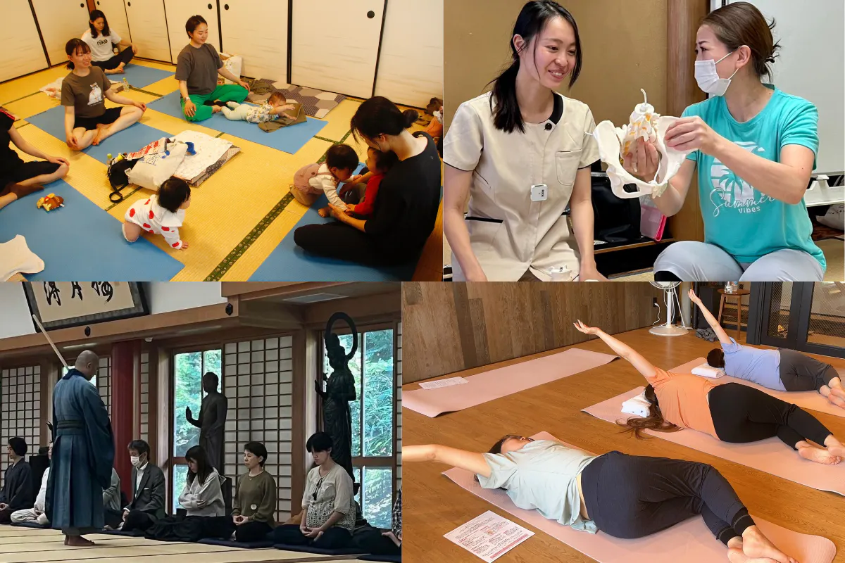 ③左下:お寺でのマタニティ座禅の発信 ④右下:産後ヨガの様子