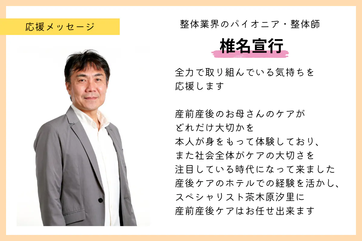 茶木原さんは、助産師であっても専門的に学ばないと得られないような、産後のダメージを最小限に出来るような妊娠期からのケアや、産後の骨盤・筋肉へのアプローチなど専門的な知識に基づいたケアを提供されています。このような幅広いサポートを行ってくれる場所を、今後も継続していただけるよう応援しています。