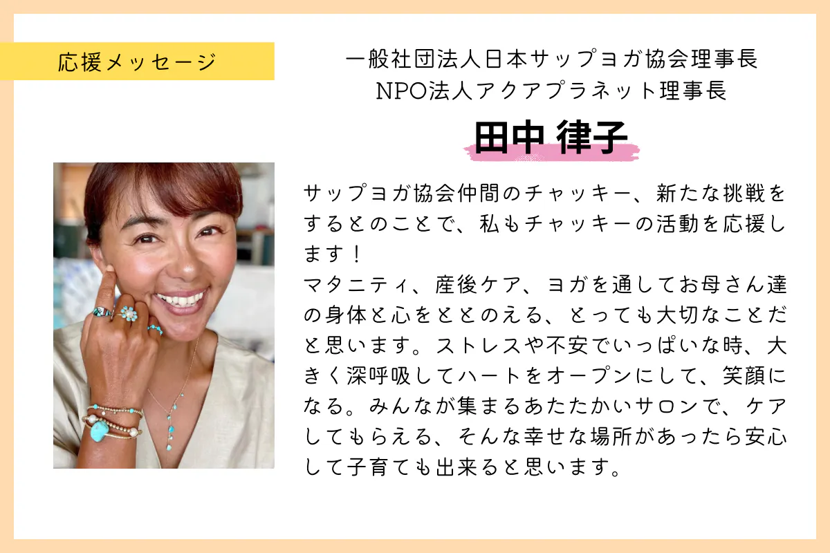 「大きな変化に伴う負担は身体だけではない。また《心と体は繋がっている》」ことを実感。①ヨガ等で身体を動かすことと、②身を委ねてケアを受けることどちらも大切だと再認識し、リラクゼーションとして両方の機能を持ち合わせた、妊産婦のケアを本格的に導入したサロンを横浜に2025年6月オープン予定。