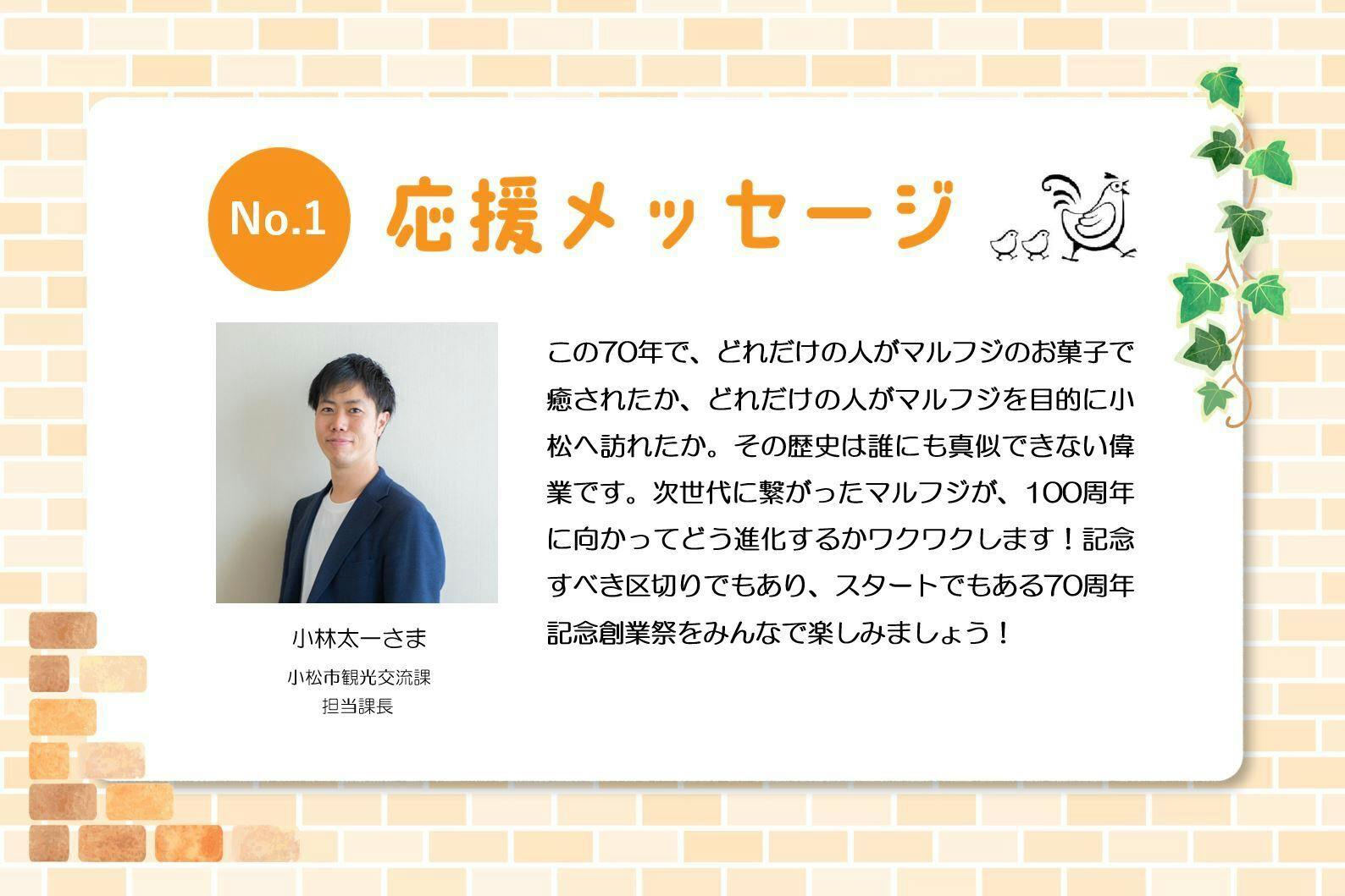 「この70年で、どれだけの人がマルフジのお菓子で癒されたか、どれだけの人がマルフジを目的に小松へ訪れたか。その歴史は誰にも真似できない偉業です。次世代に繋がったマルフジが、100周年に向かってどう進化するかワクワクします! 記念すべき区切りでもあり、スタートでもある70周年記念創業祭をみんなで楽しみましょう!」