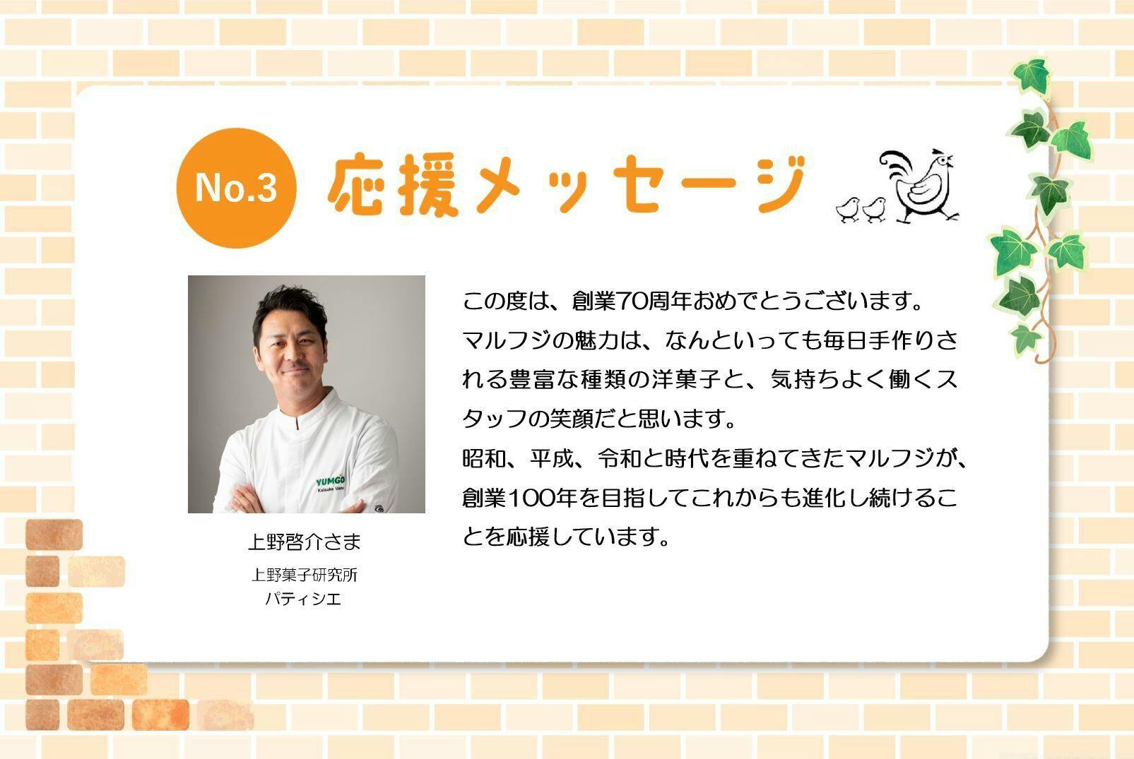 「この度は、創業70周年おめでとうございます。 マルフジの魅力は、なんといっても毎日手作りされる豊富な種類の洋菓子と、気持ちよく働くスタッフの笑顔だと思います。 昭和、平成、令和と時代を重ねてきたマルフジが、創業100年を目指してこれからも進化し続けることを応援しています」