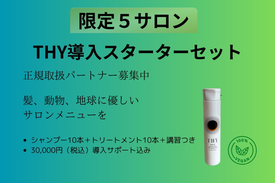 THYの理念に共感し、商品をお客様に届けてくださる美容室・ヘッドスパサロン様向けの特別リターンです。「動物にも環境にもやさしいサロンメニューを広めたい」という想いを共有できる、全国のオーナー様を対象にしています。まずは5サロン仲間を作りたいです!