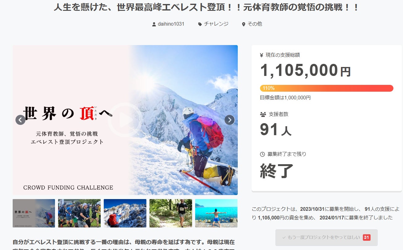 自分のエベレスト登頂は、決して命を粗末にする訳ではなく、せっかくいただいた命で自分ができる最大限の事にチャレンジしたいという目的があります。 今までの人生を振り返ってみても、色々なことにチャレンジをし続けてきたので、今後の人生も死ぬまでチャレンジを続けていきます!!