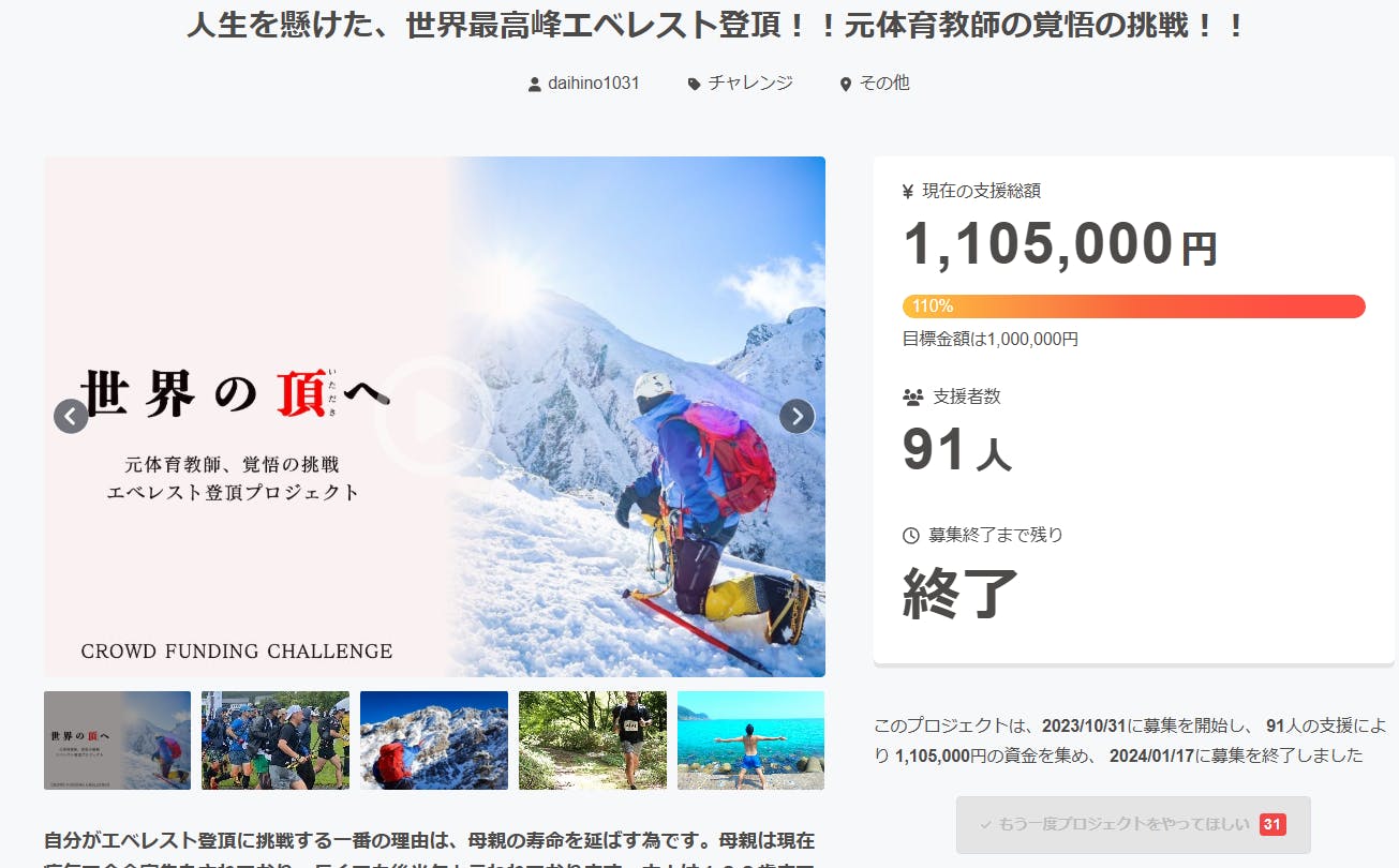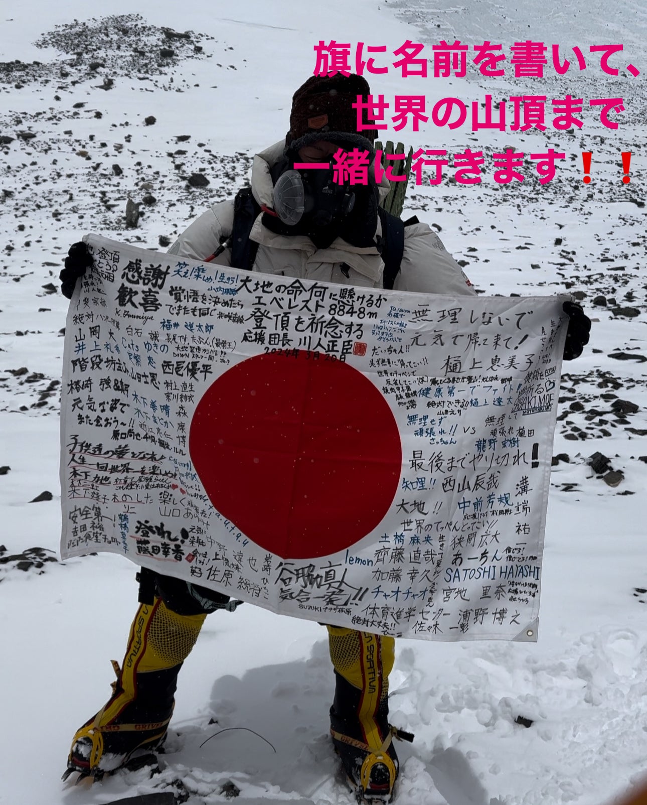 今回の挑戦は、人生最大のプロジェクトであり、何としてでも必ず成功させます!!みなさんのご協力・ご支援がなければ、間違いなくエベレストには登れません。全てを捨てて、エベレスト登頂を必ず成功させますので、是非宜しくお願い致します。