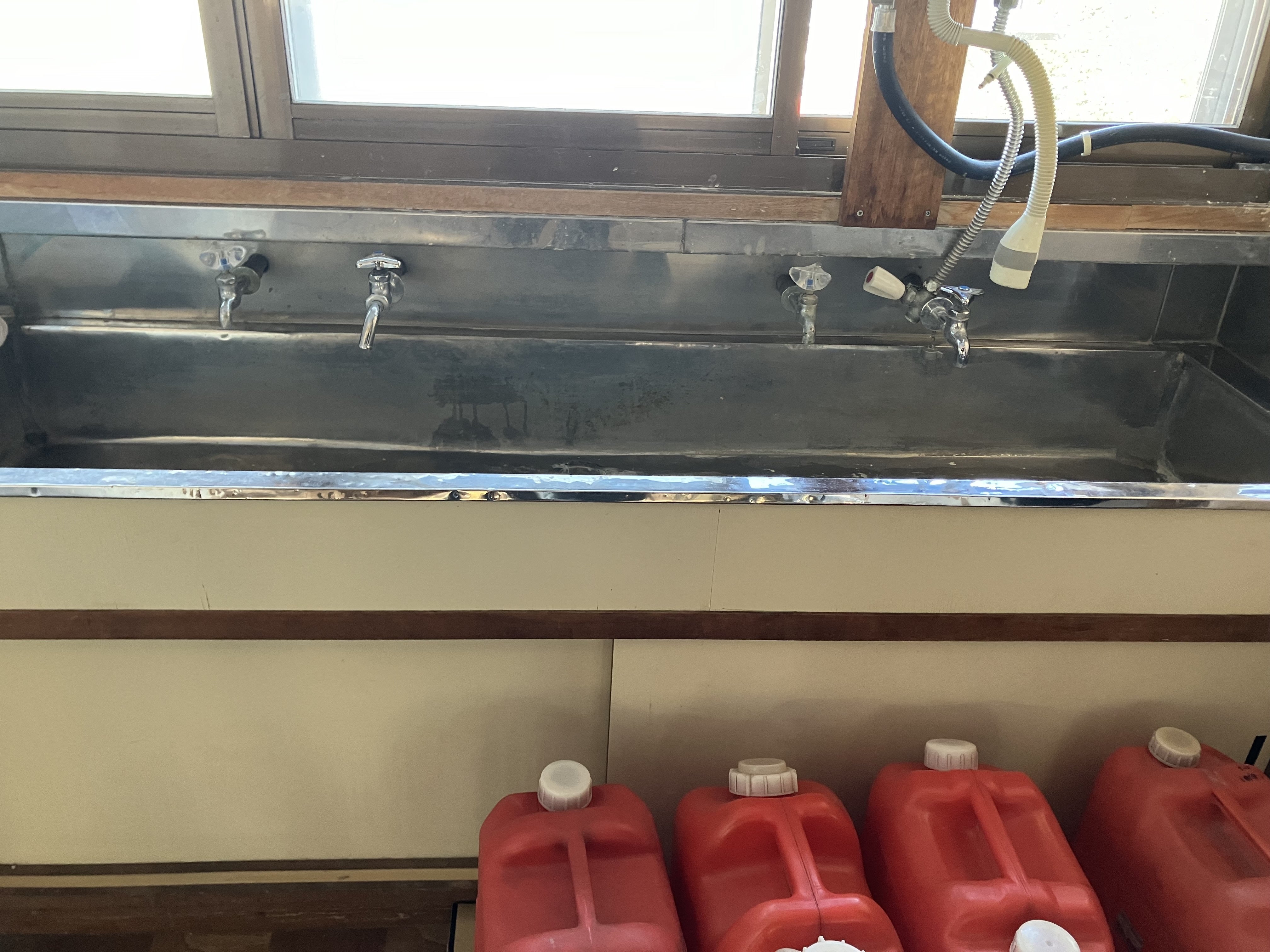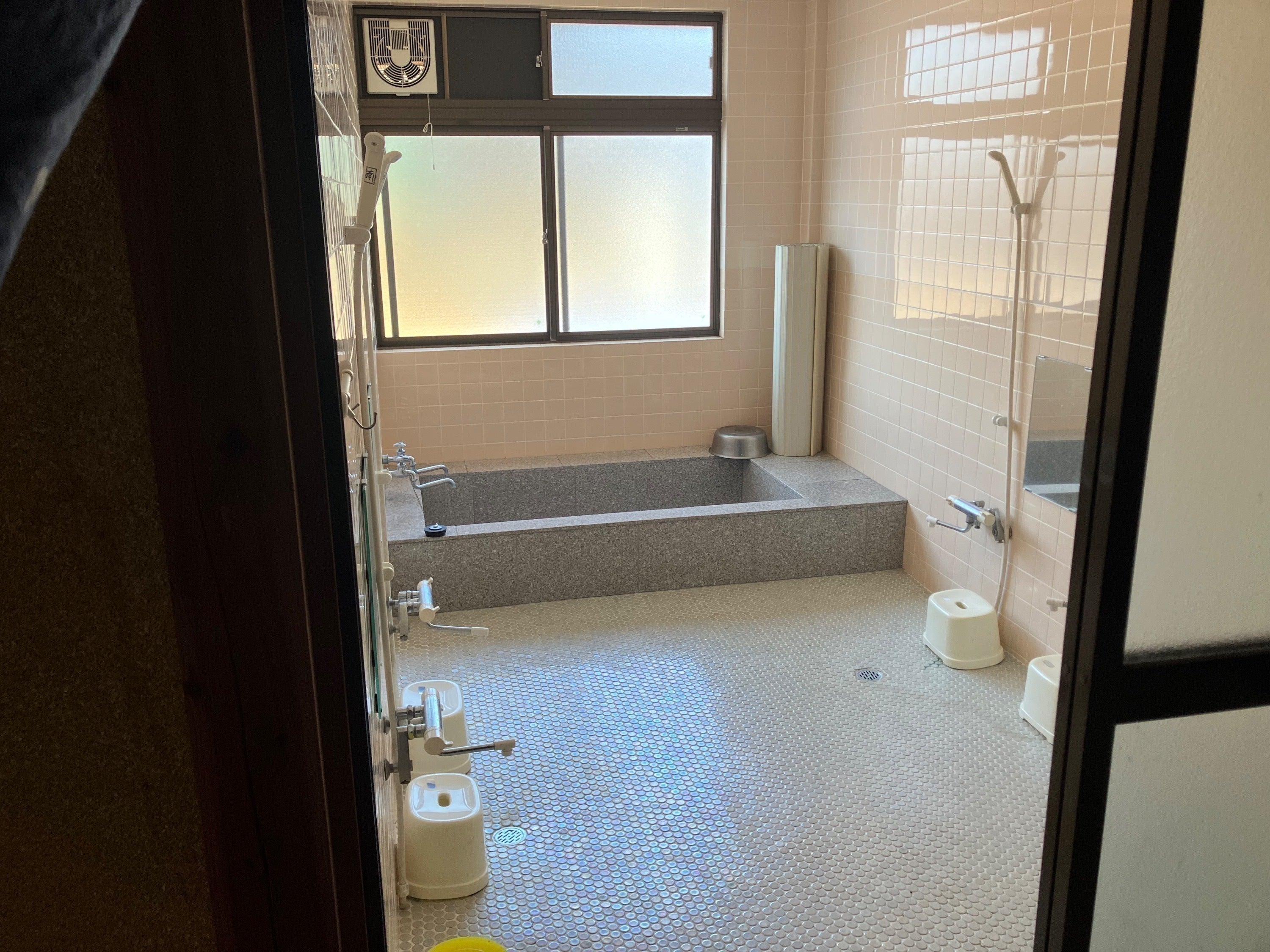 また、トイレの隣に大浴場がありシャワー4個、お風呂一つあります。大浴場は4人まで入れます。蛇口も4個あります。