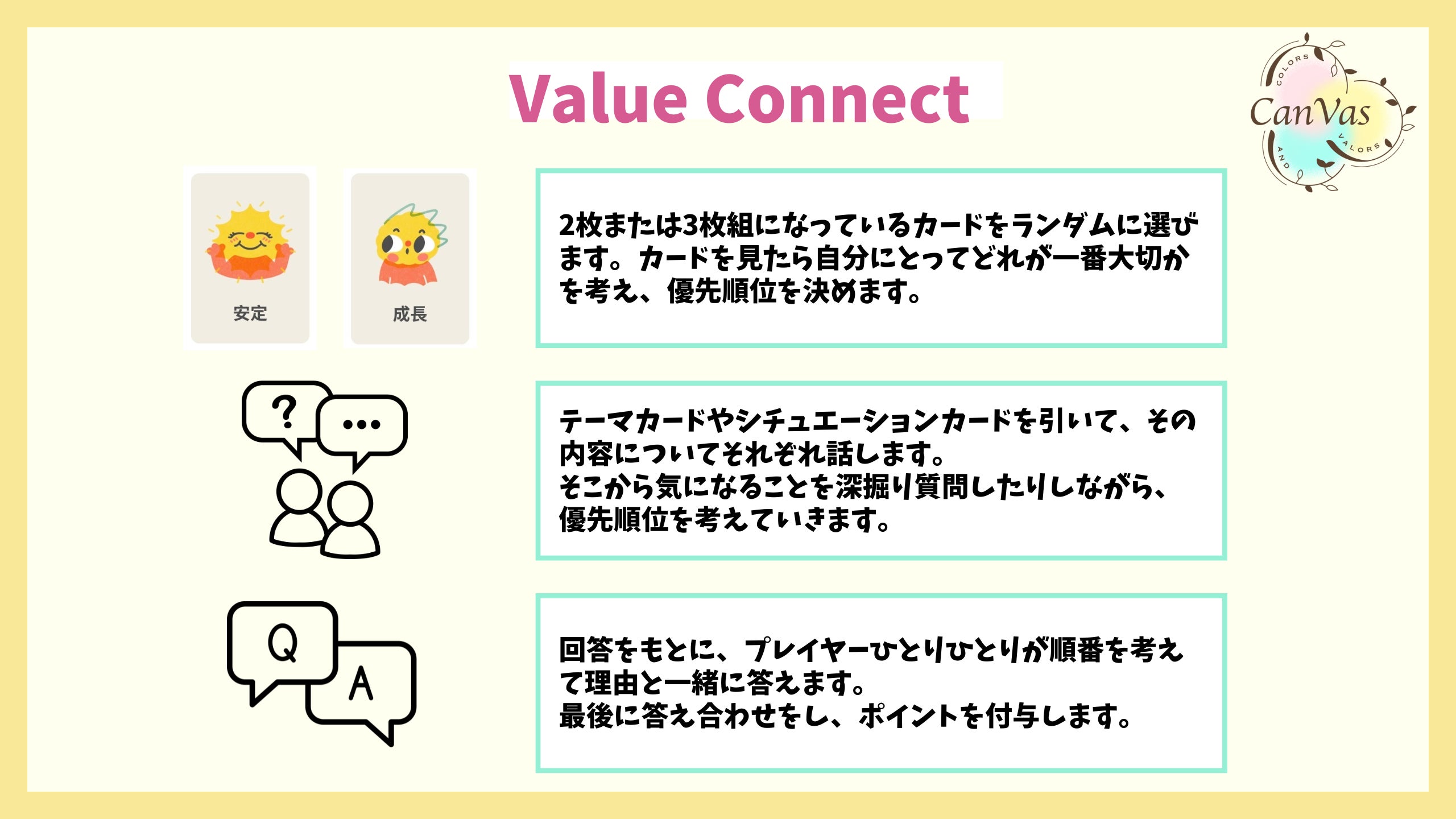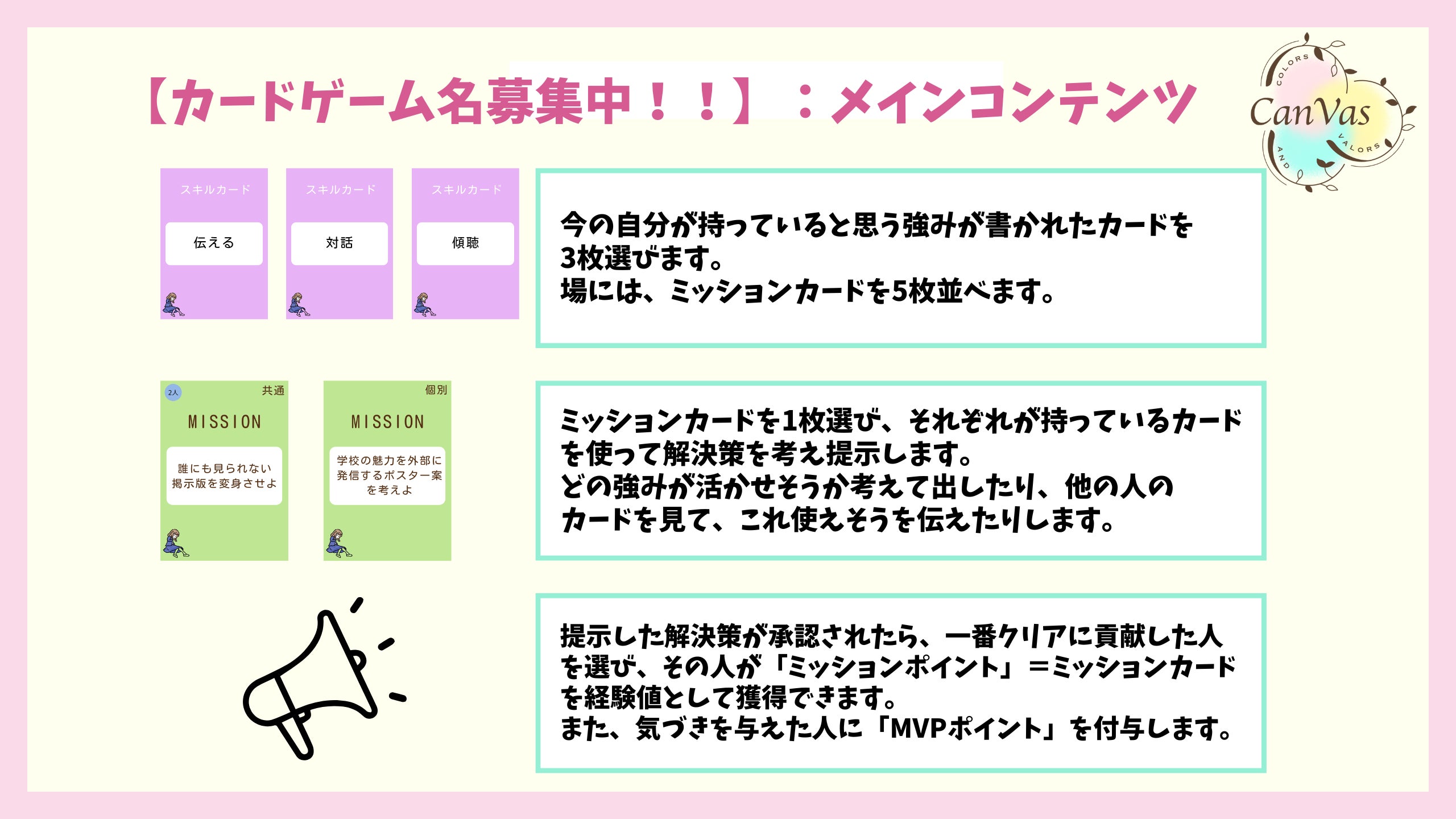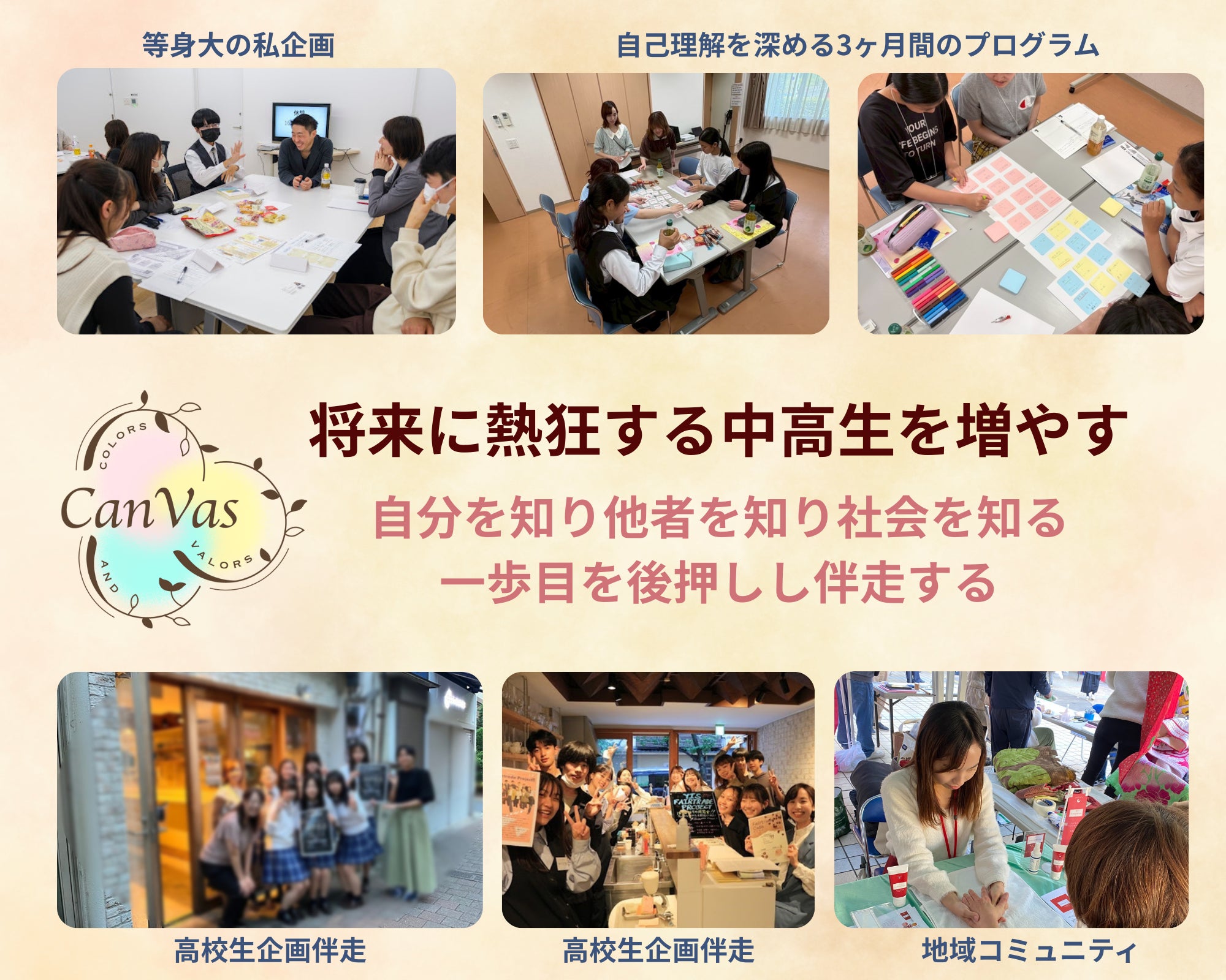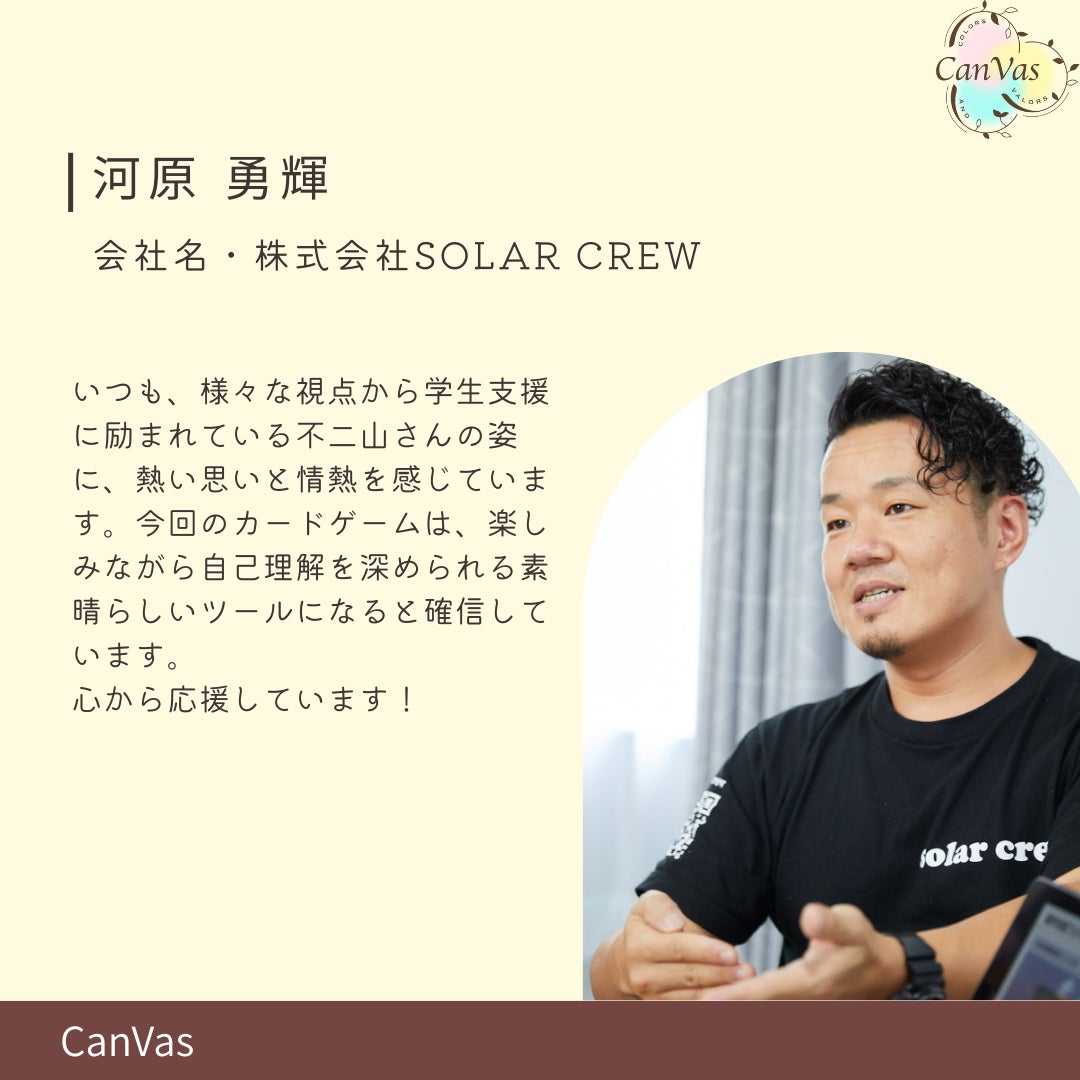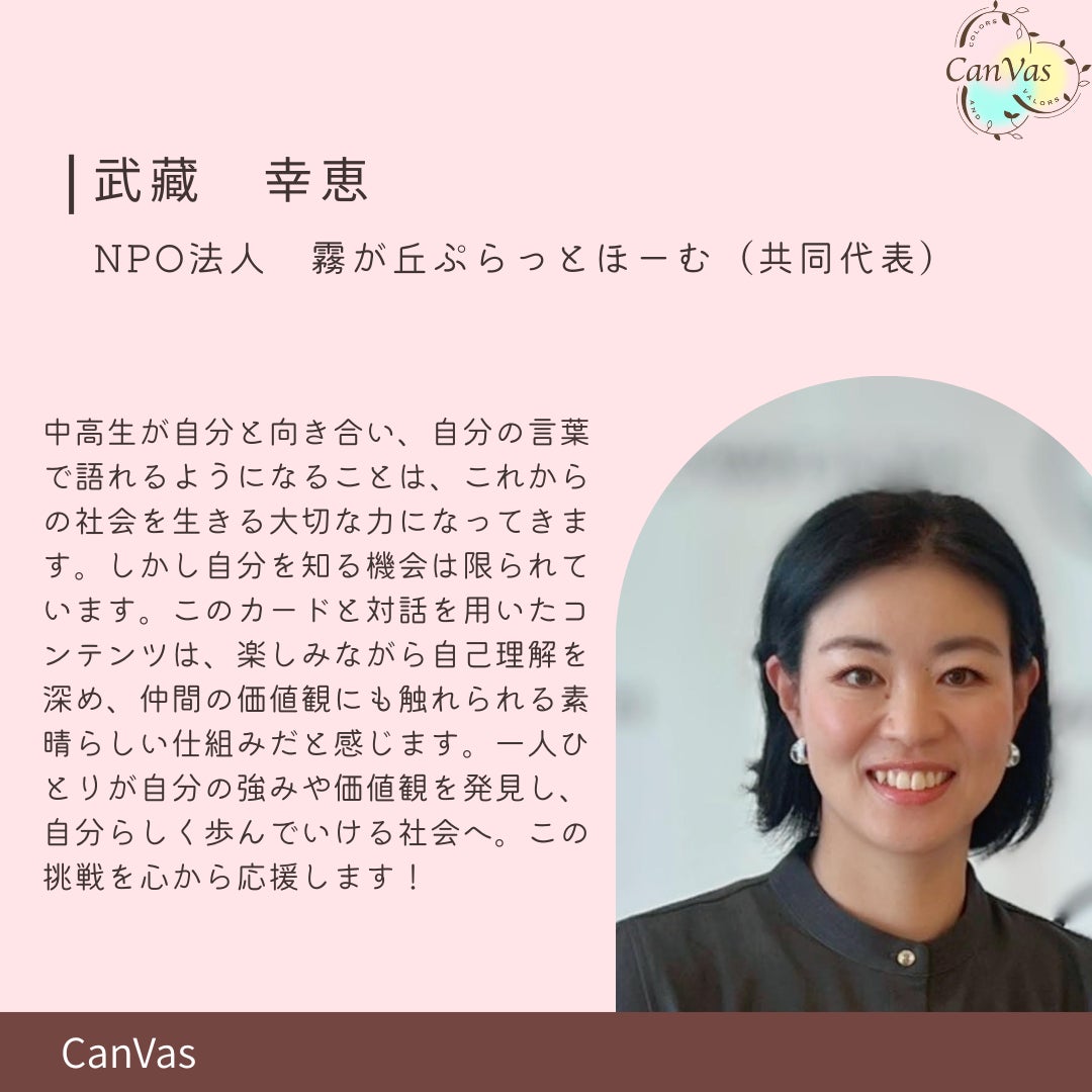 自分を彩る好き・大切なこと・価値観・強み・思考・思い...を人生というキャンバスに描いていく。そして、勇気をもって一歩踏み出し、さまざまな人との出会いや経験を通して自分の価値に気づいてほしい。その想いを込めて、Colors and Valors=CanVasと名付けました。
