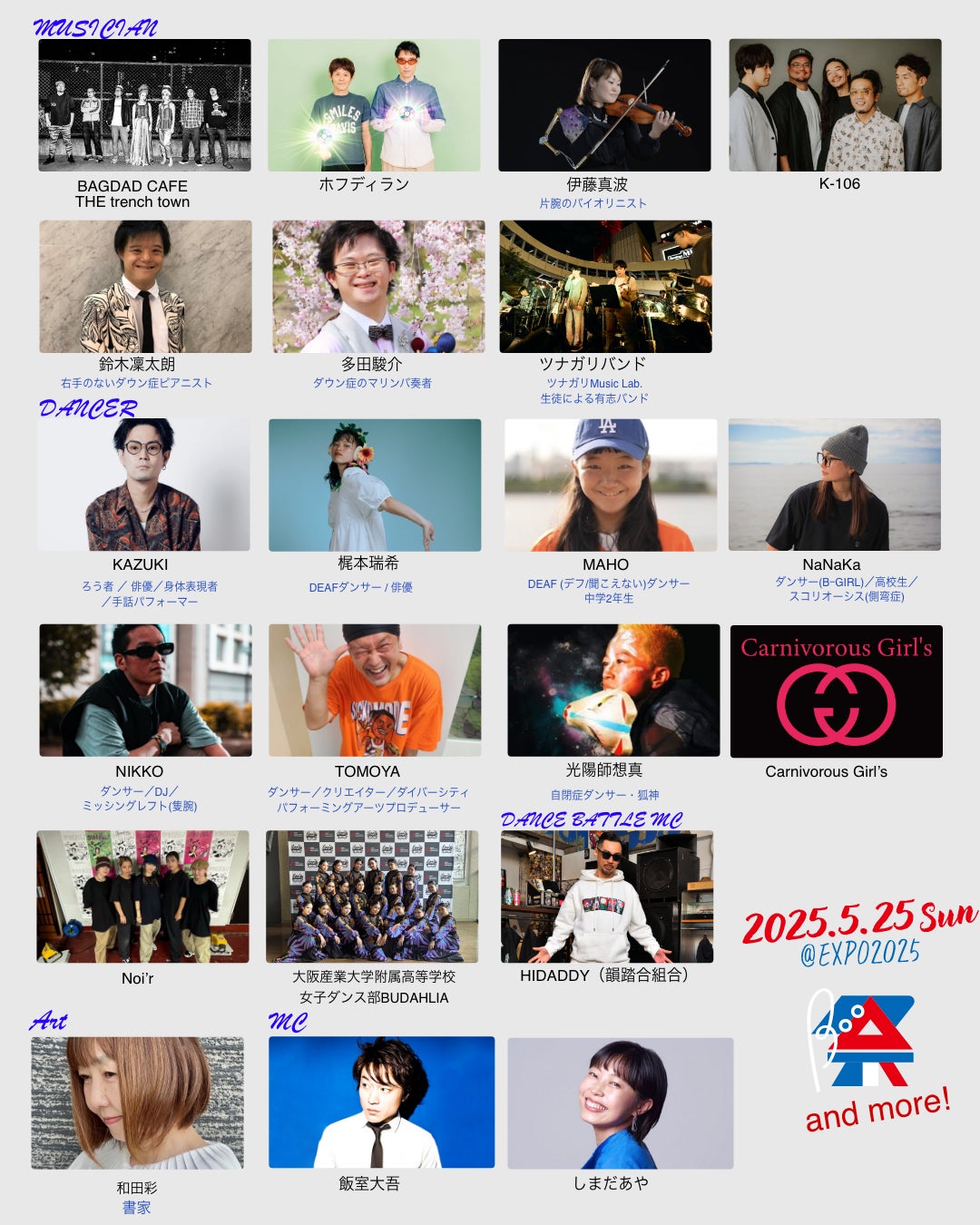 BAGDAD CAFE THE trench town / CHEHON / DIVERz / DJ特攻一番機(EYE DJ・ALS) / 韻踏合組合 / 奇妙礼太郎 / 小柳拓人(自閉症のピアニスト) / 酒井響希(全盲のドラマー) /式町水晶(ポップヴァイオリニスト・脳性麻痺) / 鈴木凜太朗(右手のないダウン症のピアニスト) / ⻄岡弘治(アトリエコーナス) etc.