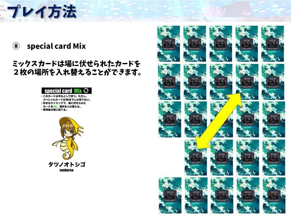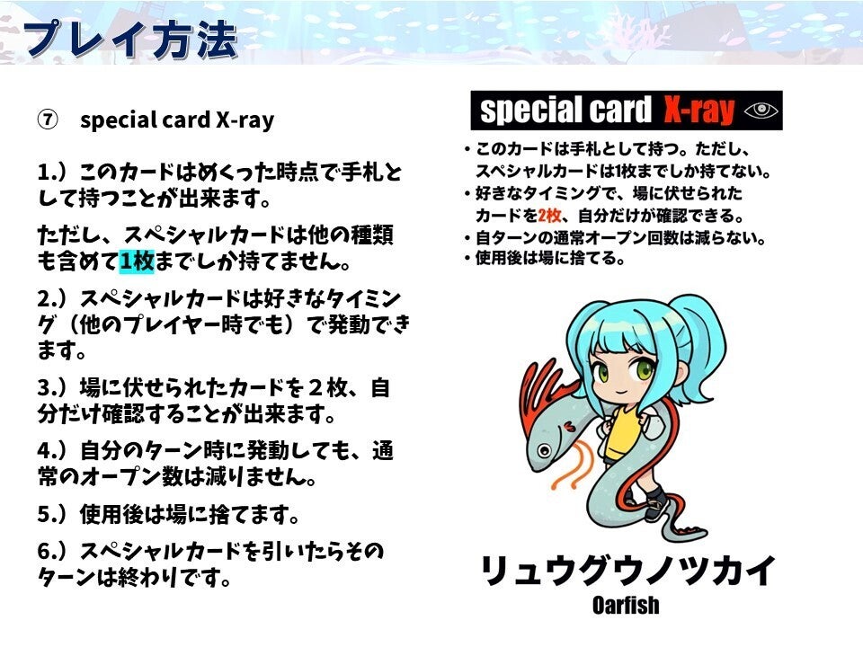 竜宮城に住む乙姫が、カレーで作るために海の仲間を捕まえるゲーム『竜宮城シーフードカレー』神経衰弱をベースで、5枚連番で引いた人が勝利するカードゲームです。