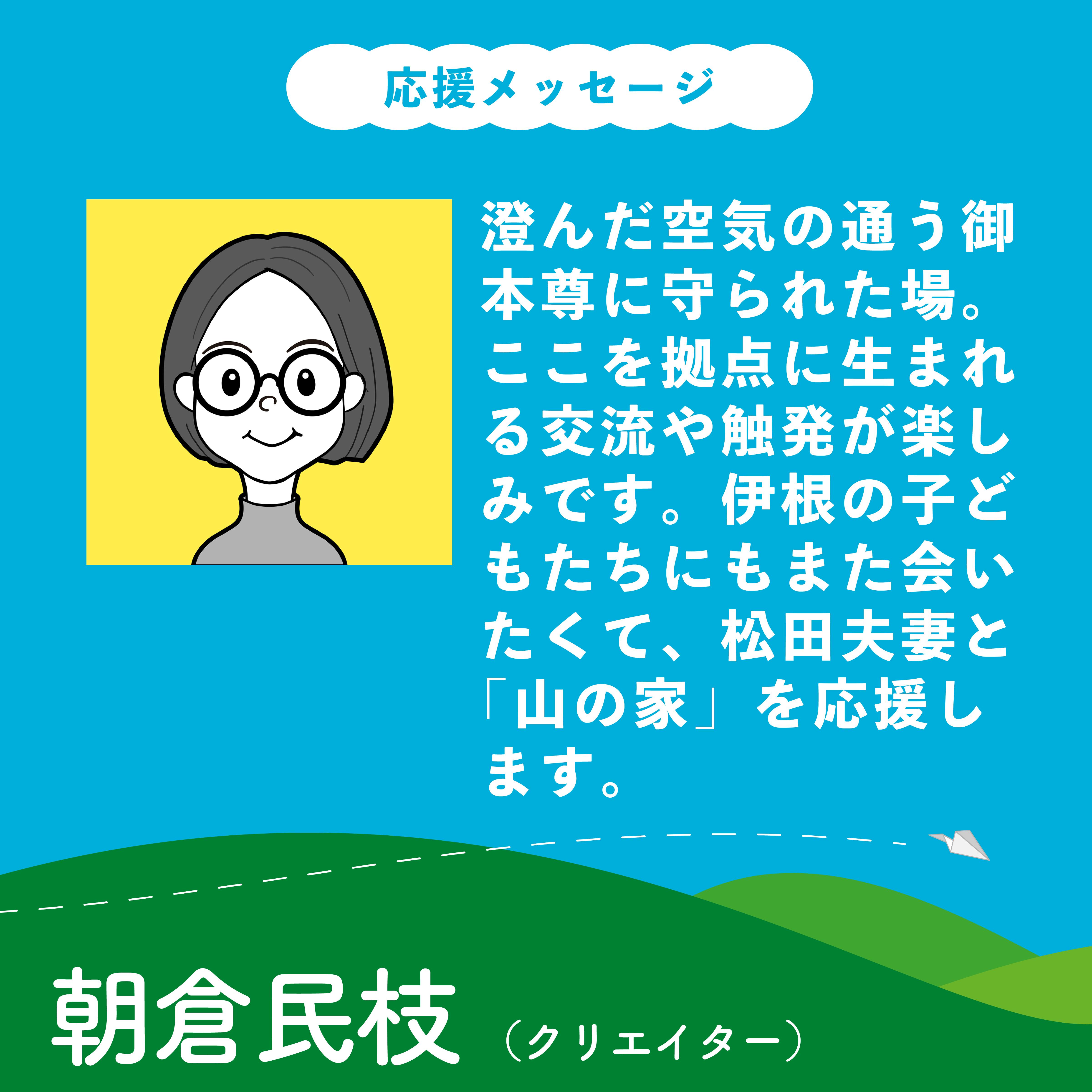 澄んだ空気の通う御本尊に守られた場。ここを拠点に生まれる交流や触発が楽しみです。伊根の子どもたちにもまた会いたくて、松田夫妻と「山の家」を応援します。