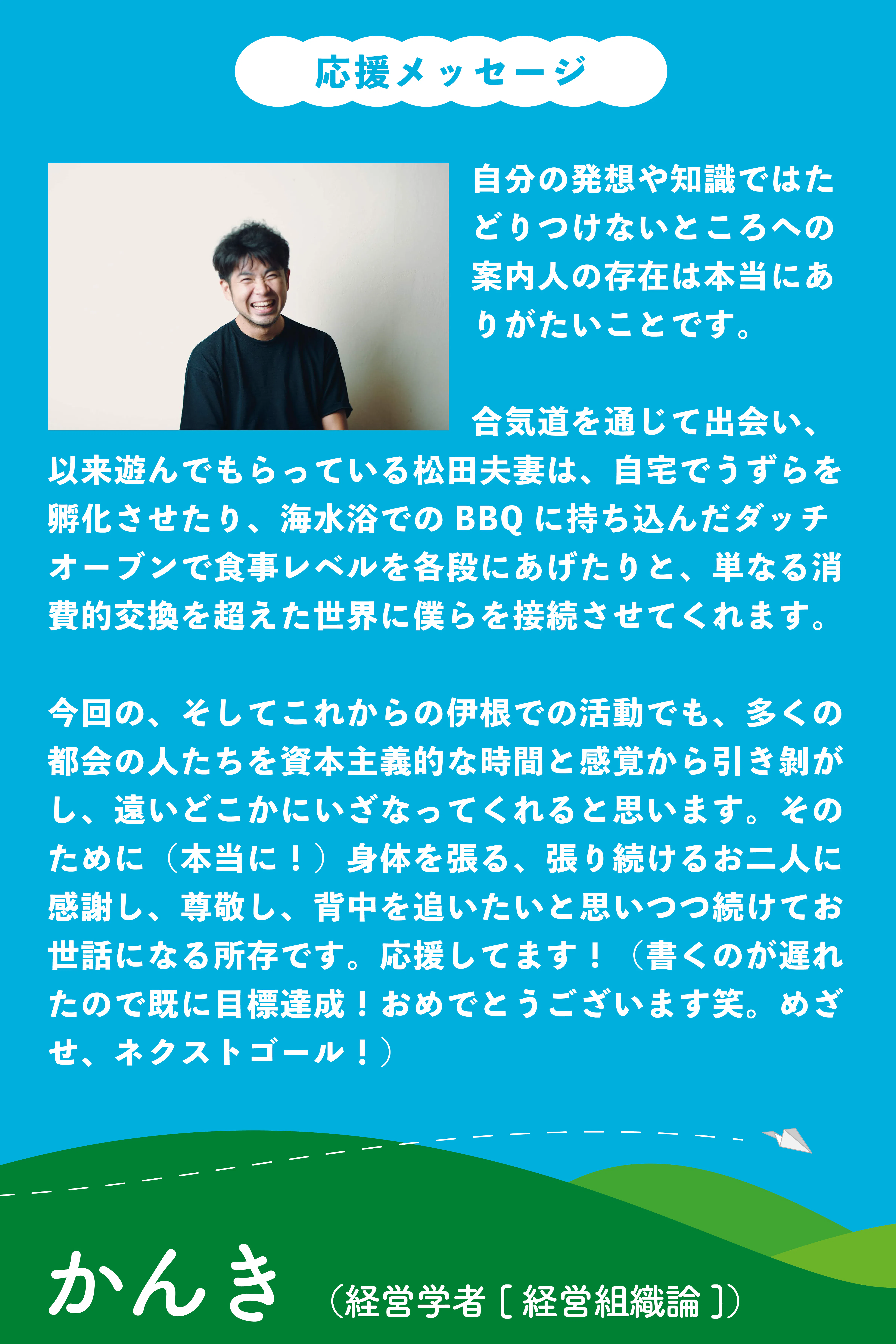 今回の、そしてこれからの伊根での活動でも、多くの都会の人たちを資本主義的な時間と感覚から引き剝がし、遠いどこかにいざなってくれると思います。そのために(本当に!)身体を張る、張り続けるお二人に感謝し、尊敬し、背中を追いたいと思いつつ続けてお世話になる所存です。応援してます!(書くのが遅れたので既に目標達成!おめでとうございます笑。めざせ、ネクストゴール!)