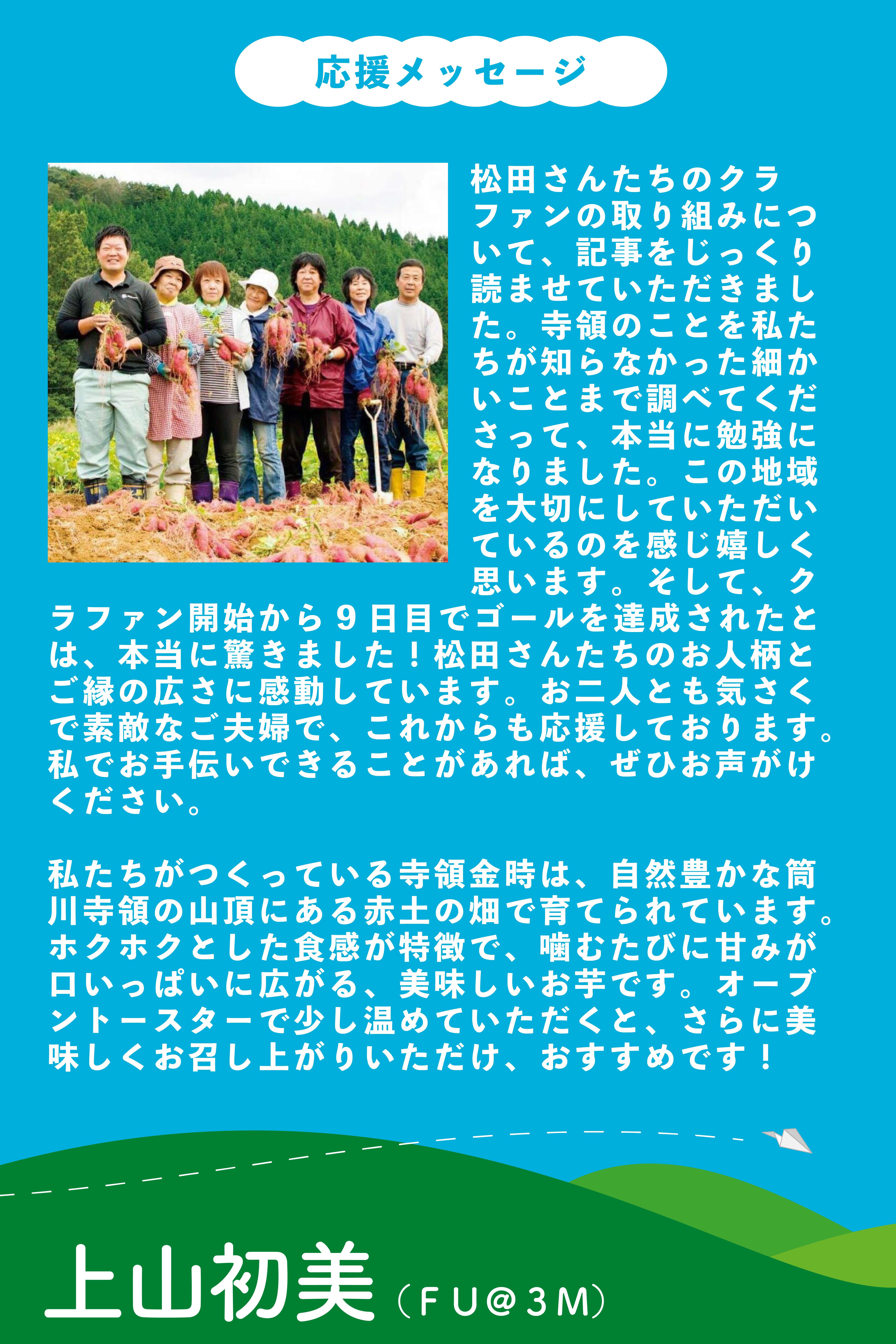 松田さんたちのクラファンの取り組みについて、記事をじっくり読ませていただきました。寺領のことを私たちが知らなかった細かいことまで調べてくださって、本当に勉強になりました。この地域を大切にしていただいているのを感じ嬉しく思います。そして、クラファン開始から9日目でゴールを達成されたとは、本当に驚きました!松田さんたちのお人柄とご縁の広さに感動しています。お二人とも気さくで素敵なご夫婦で、これからも応援しております。私でお手伝いできることがあれば、ぜひお声がけください。