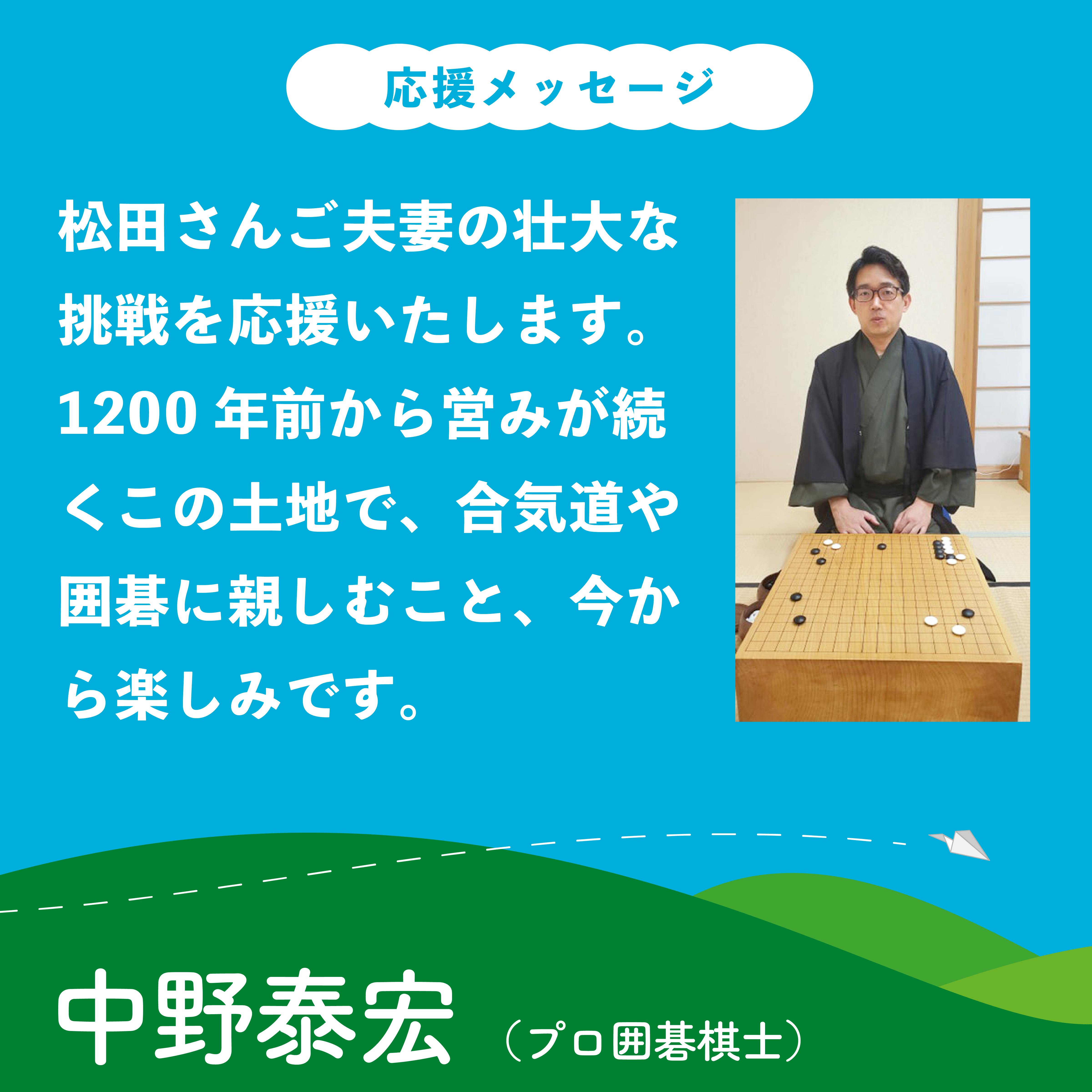 松田さんご夫妻の壮大な挑戦を応援いたします。1200年前から営みが続くこの土地で、合気道や囲碁に親しむこと、今から楽しみです。