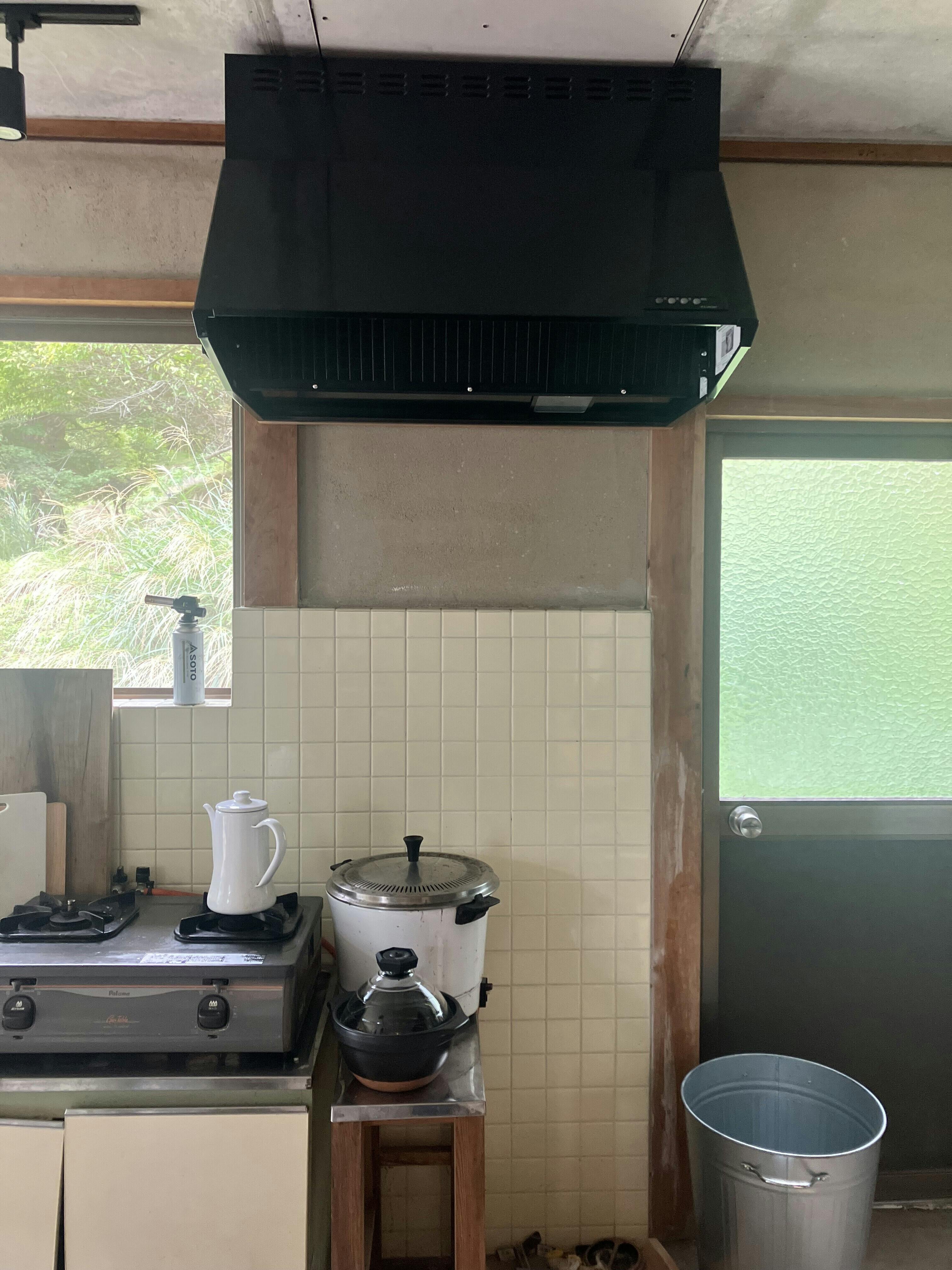 【キッチン】カフェ開業に向け、一歩前進!まず厨房に新しいレンジフードが導入されました!保健所の検査基準をクリアするための大きな一歩です。ここから、清潔で機能的なキッチンにさらに進化させるべく設備の導入に向けて設計を進めています。