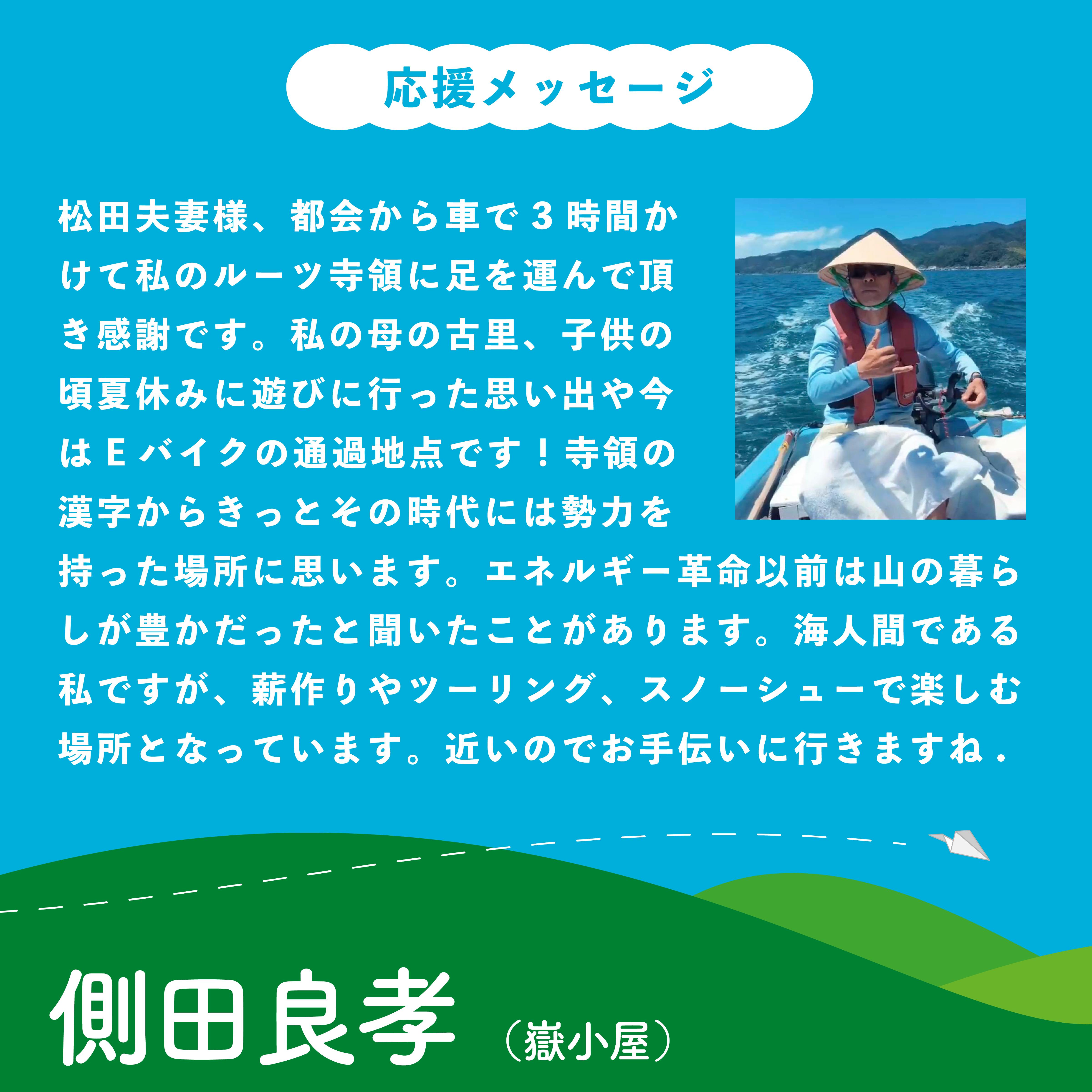 松田夫妻様、都会から車で3時間かけて私のルーツ寺領に足を運んで頂き感謝です。私の母の古里、子供の頃夏休みに遊びに行った思い出や今はEバイクの通過地点です!寺領の漢字からきっとその時代には勢力を持った場所に思います。エネルギー革命以前は山の暮らしが豊かだったと聞いたことがあります。海人間である私ですが、薪作りやツーリング、スノーシューで楽しむ場所となっています。近いのでお手伝いに行きますね.側田良孝(嶽小屋)側田さん、ありがとうございます!!!側田さんは、山の家での合気道演武会のことが京都新聞に掲載されたのをご覧になったそうで、翌週、すぐに山の家を訪ねてくださいました。私たちがちょうど西宮から向かっているときに山の家にお見えになったそうで、ご近所の福田さん経由でお電話をいただき、こんな私たちに「ぜひお会いしたいので待っています」とのお言葉をいただきました!その日の夕方に無事お会いすることができ、とても初めてとは思えないくらいにたくさんのことをお話しさせていただきました。側田さん、お母さまが寺領のご出身で、私たちのような都市からやってきた変わり者の夫婦が、なんだか楽しそうなことをしようとしていることがうれしかったそうです。しかも、側田さんご自身も合気道を長くされていたとのことで、以前は小学生に教えたりもされていたとか。元海上自衛官とあって、海の知識&経験は筋金入り!側田さんはお仕事を退職なさって、伊根町の山側、海側、そして夏も雪のシーズンも問わず、自然と思いっきり遊ぶイベントをいろいろと精力的に企画されているそうです。これに加えて合気道もというのは少し難しいようでしたが、私たちの「寺領の寺子屋」ともコラボさせていただきたい!と意気投合。特に、雪のシーズンの遊びは私達にはなすすべがなかったので、スノーシュー遊びをご教示いただけそうで、今から冬が楽しみになってきました!またゆっくり、お話しさせてくださいね!