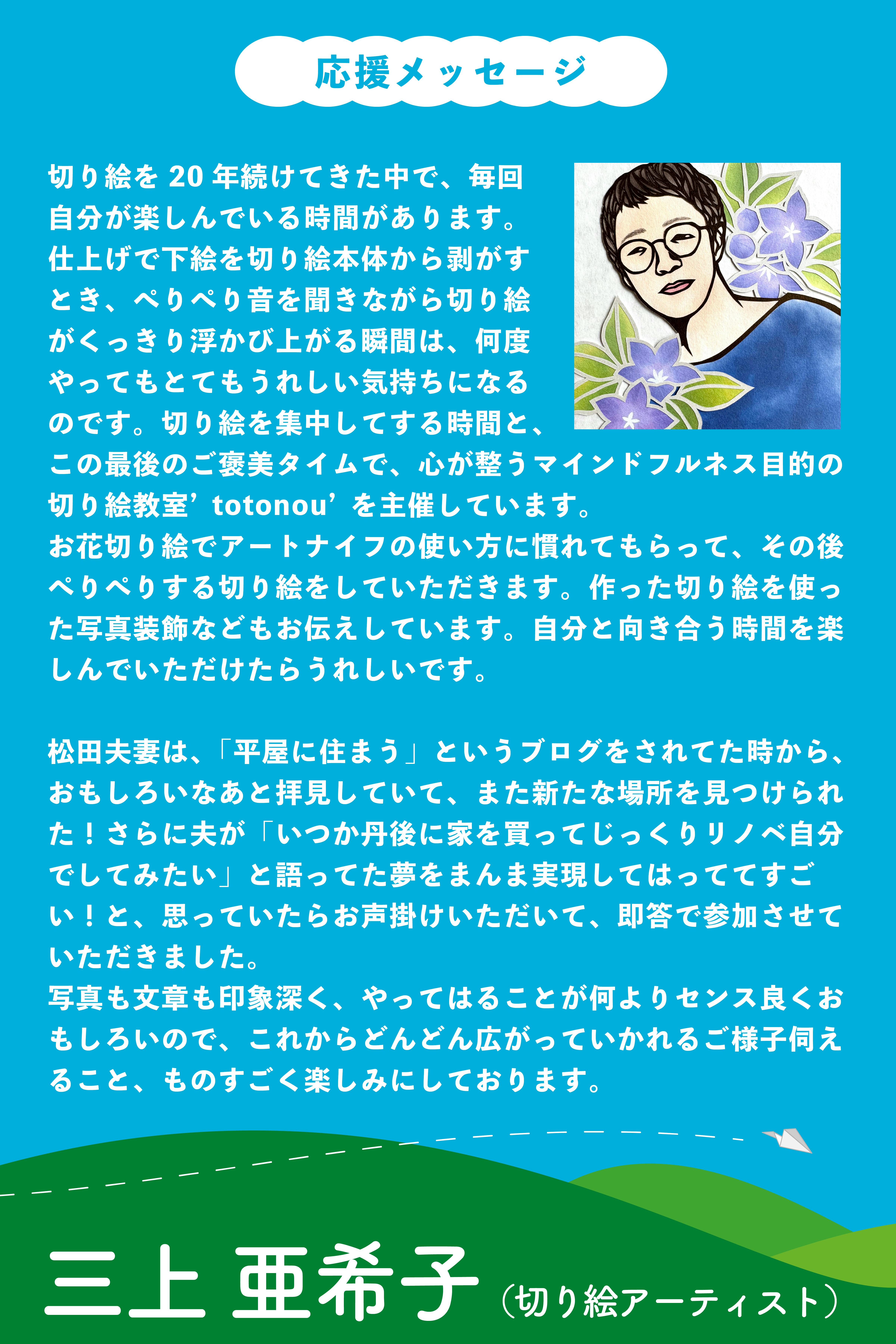 切り絵を20年続けてきた中で、毎回自分が楽しんでいる時間があります。仕上げで下絵を切り絵本体から剥がすとき、ぺりぺり音を聞きながら切り絵がくっきり浮かび上がる瞬間は、何度やってもとてもうれしい気持ちになるのです。切り絵を集中してする時間と、この最後のご褒美タイムで、心が整うマインドフルネス目的の切り絵教室’totonou’を主催しています。お花切り絵でアートナイフの使い方に慣れてもらって、その後ぺりぺりする切り絵をしていただきます。作った切り絵を使った写真装飾などもお伝えしています。自分と向き合う時間を楽しんでいただけたらうれしいです。松田夫妻は、「平屋に住まう」というブログをされてた時から、おもしろいなあと拝見していて、また新たな場所を見つけられた!さらに夫が「いつか丹後に家を買ってじっくりリノベ自分でしてみたい」と語ってた夢をまんま実現してはっててすごい!と、思っていたらお声掛けいただいて、即答で参加させていただきました。写真も文章も印象深く、やってはることが何よりセンス良くおもしろいので、これからどんどん広がっていかれるご様子伺えること、ものすごく楽しみにしております。三上亜希子(切り絵アーティスト)三上さん、ありがとうございます!!三上さんとの作品の出会いは、夫が一人暮らししていた京都時代に通っていたカフェ・efishでの展示でした。夫を通じて私も作品を知ることになり、当時着物にはまっていた私は、「ふりふ」のゆかたの柄や、Maduでのご活躍を見ては「いつかお目にかかりたい!」と思っていました。去年から、三上さんの切り絵を自分で作ってみることができるワークショップを展開されていることを知り、ぜひ私も参加してみたいと思っていました。そんな矢先、私達のプロジェクトで「伊根町と都市圏の人たちの文化交流」というテーマが立ち上げることになったので、真っ先に三上さんにオファーさせていただいたのでした。ご快諾いただけて本当にうれしかったです!伊根町の方々と、切り絵にチャレンジできる日がとても楽しみです!三上さん、切り絵を始められて20年になるそうです!20周年を記念して、青山のMaduで、作品の展示会が行われます。切り絵はじめて20周年展 2025年6月28日(土)〜7月4日(金) ENCOUNTER Madu Aoyama(東京・青山)