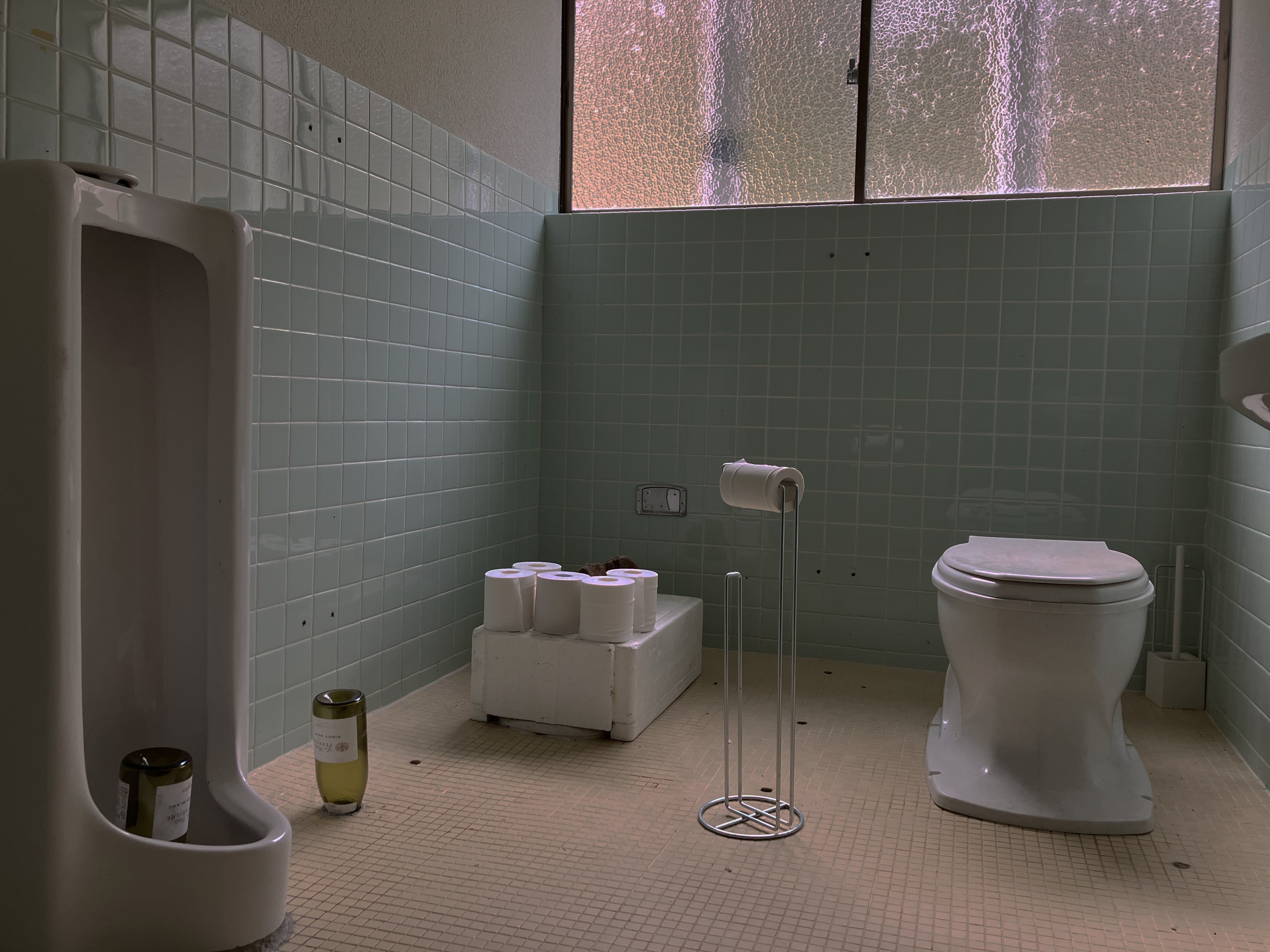 左:カバーをかけた和式のぼっとん便器。男性用小便器は現在使用禁止中。
