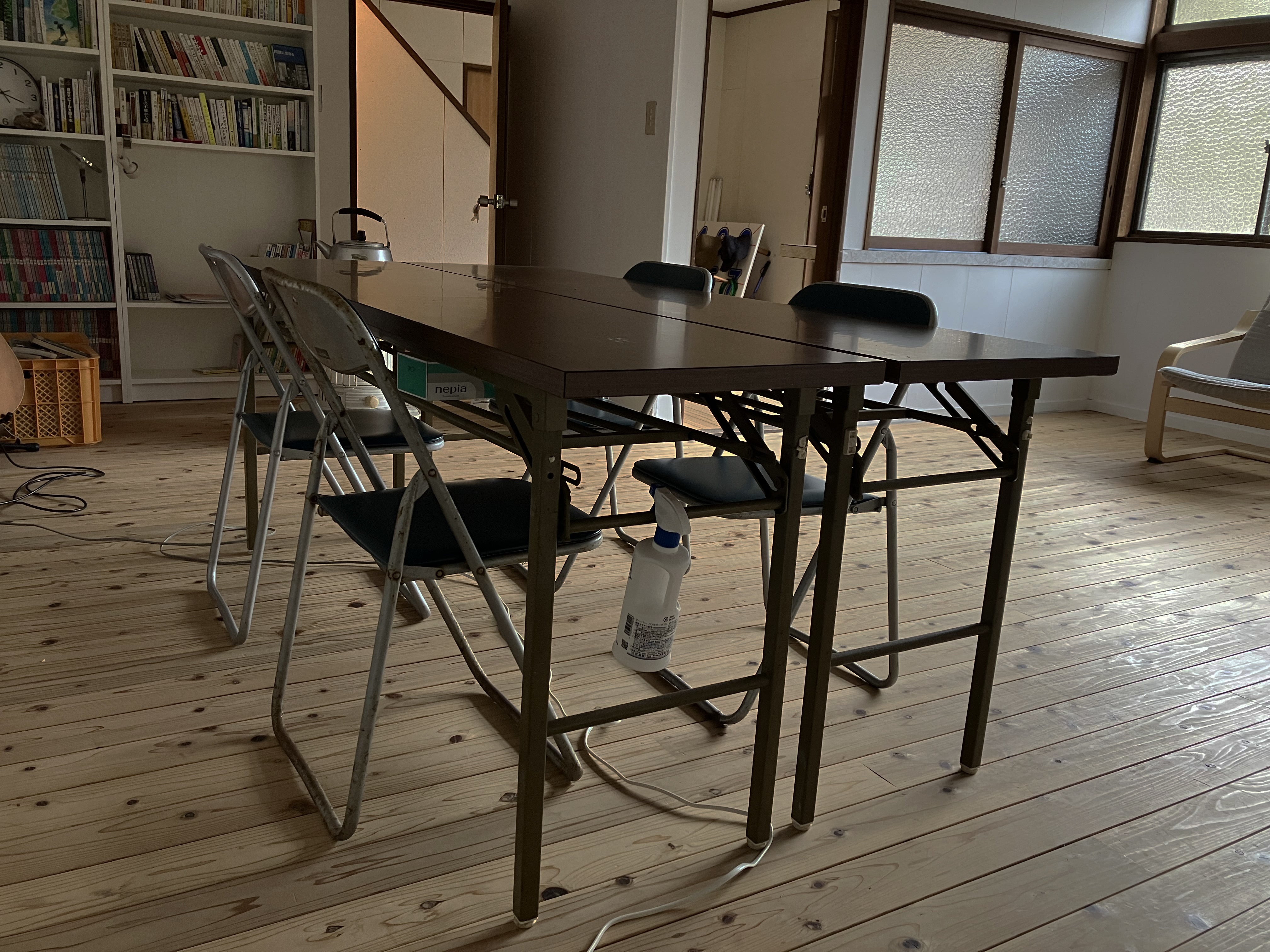 床・壁の内装はDIYで完成させたものの、家具は元々あった長机とパイプ椅子を使用中。