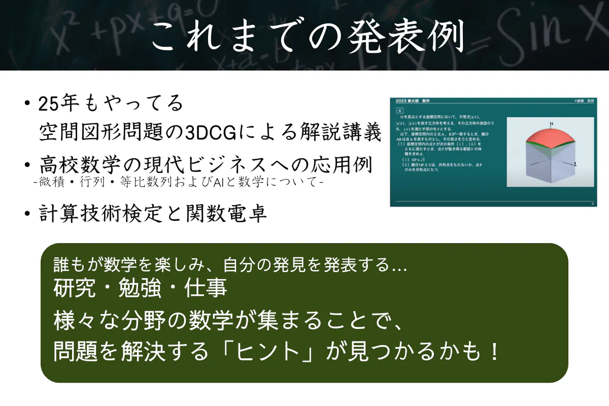 本会がそんなきっかけの一助になれたらとても嬉しいです。数学を楽しみたい人の輪を広げたいです。