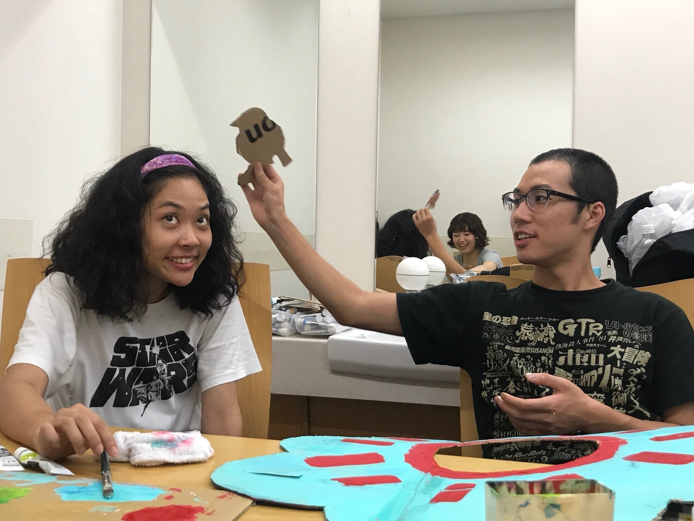 和気藹々と小道具を作る役者。左の関は、藝大の美術学部(脚本の島川の同期!)の力を発揮して、様々な小道具を作ってくれました!