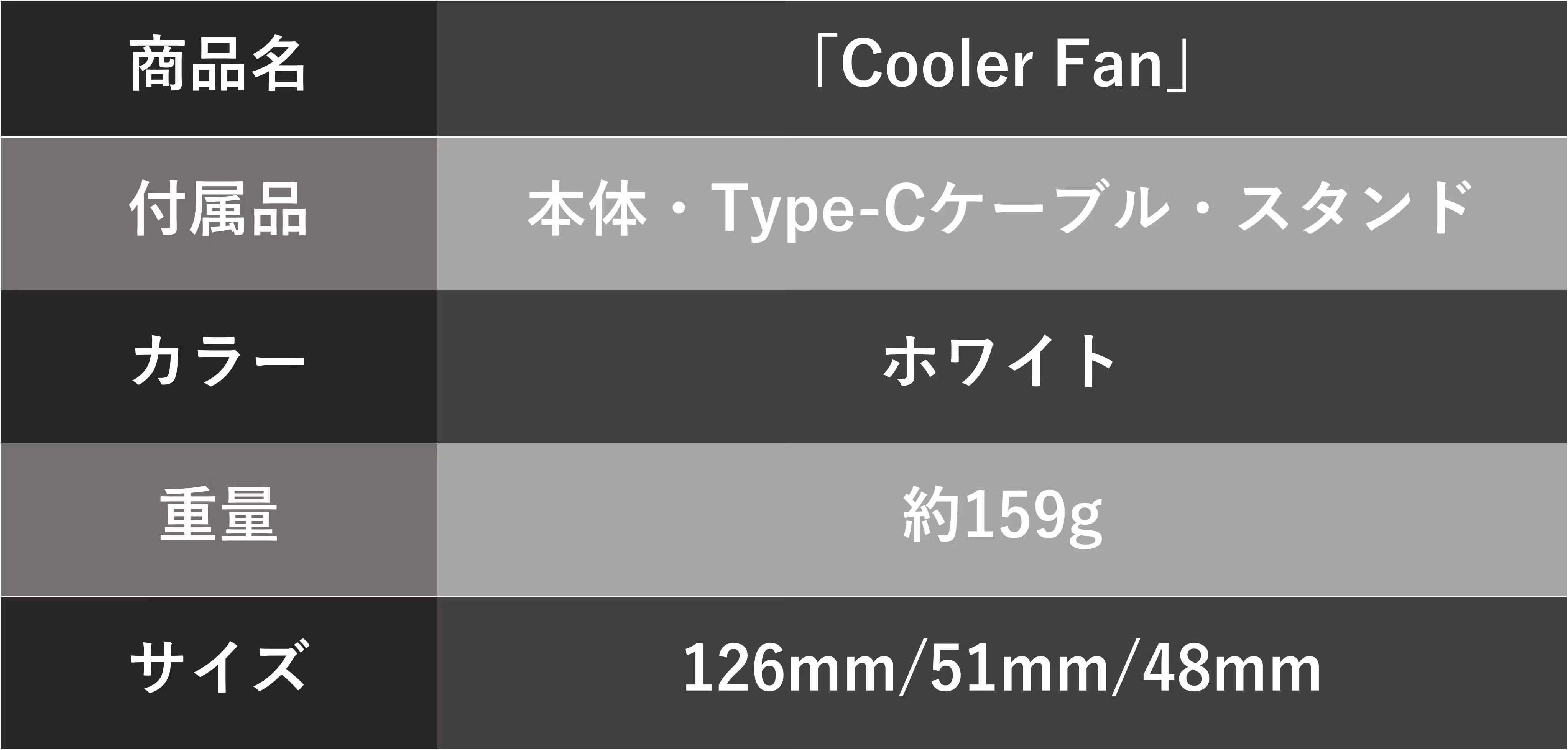 いつでもどこでも、スタイリッシュに、そして静かに、かつスピーディーに、火照った体を冷却できる、それが【Cooler Fan】です。