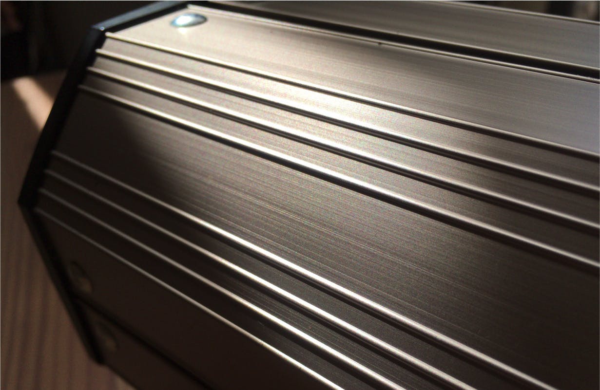 ・アルミは国内にて押出成形を行いその場でアルマイト処理(ステンレス色)を施した後にクリア塗装を行い耐食性を上げております。押出形状はキズが目立ちにくいリブ構造でスリキズなども線キズにとどめる意匠性を持っています。