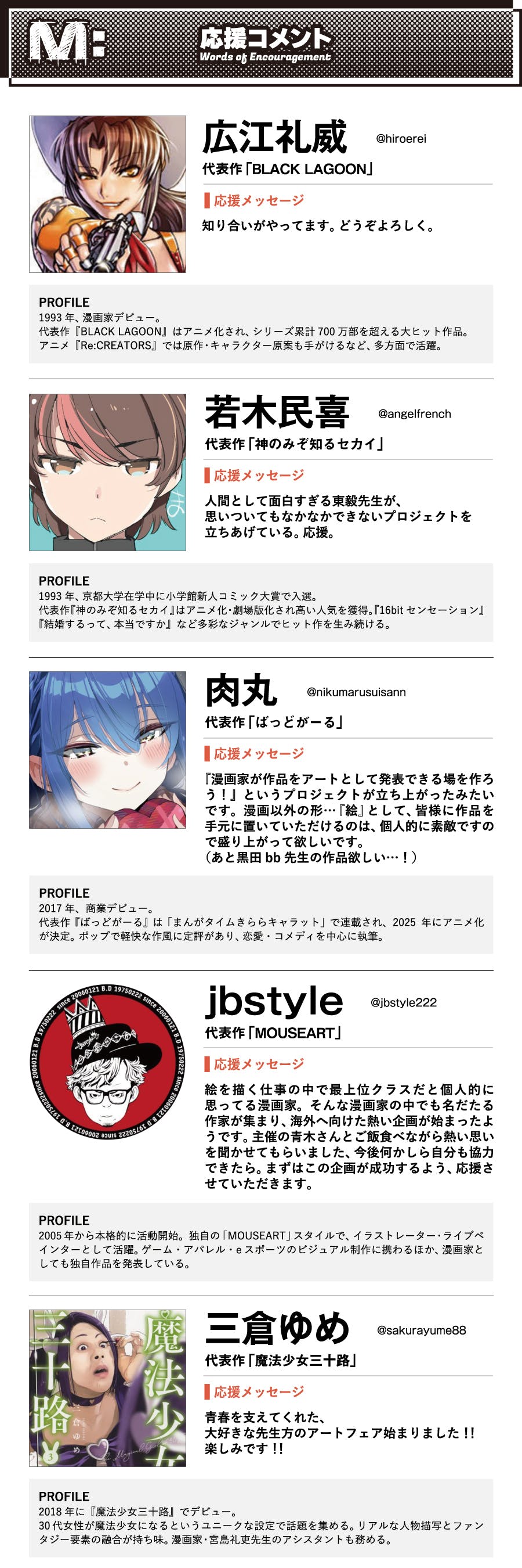 広江礼威先生、若木民喜先生、肉丸先生、jbstyle先生、三倉ゆめ先生から、心温まる応援メッセージをいただきました。