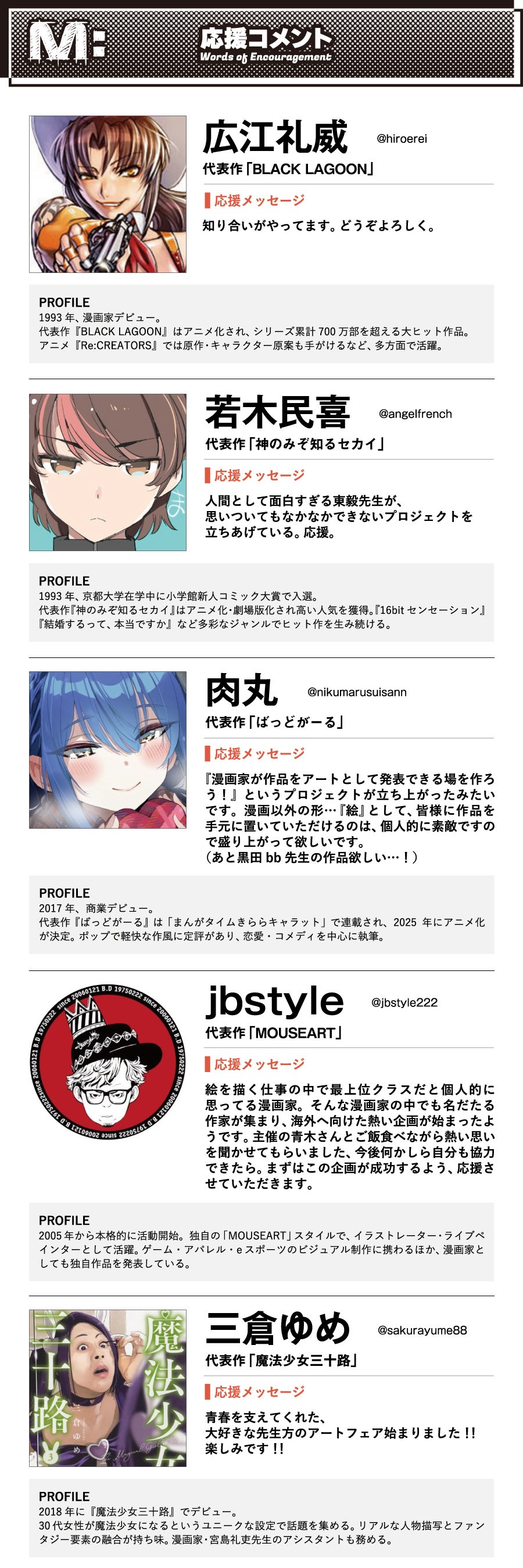 特製図録にお名前を掲載できる特典を追加!現在、クラウドファンディングでご支援いただいた方にお届けする特製図録に、ご支援者さまのお名前(ハンドルネーム可)を奥付ページに掲載する特典を追加でご用意しました!記念として、あなたのお名前を“カタチ”に残せる特別な一冊となります。「漫画家アートプロジェクト」特製図録は、本プロジェクト限定で制作される非売品仕様。特別な一冊に、あなたの想いをそっと残してみませんか?■掲載名について・12文字以内でご自由にご指定いただけます(本名でなくてもOK)・公序良俗に反する表現は掲載不可とさせていただきます・6月16日(月)23:59までに備考欄へご記入ください※ご記入がない場合は、ご登録のお名前(本名)を掲載させていただく場合があります。 本名での掲載を避けたい方は、必ず備考欄にご希望の掲載名をご記入ください。※掲載をご希望でない場合は、必ず備考欄に「不要」とご記入ください。ご支援を検討中の方は、この機会をお見逃しなく!※掲載画像は奥付見本です。実際のデザイン・レイアウトは変更となる場合がございます。