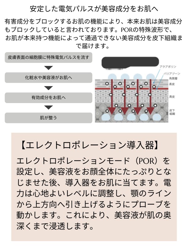 → マイナス電流の力で、美容成分を肌の奥まで浸透(0.99kHz〜1.7kHz)